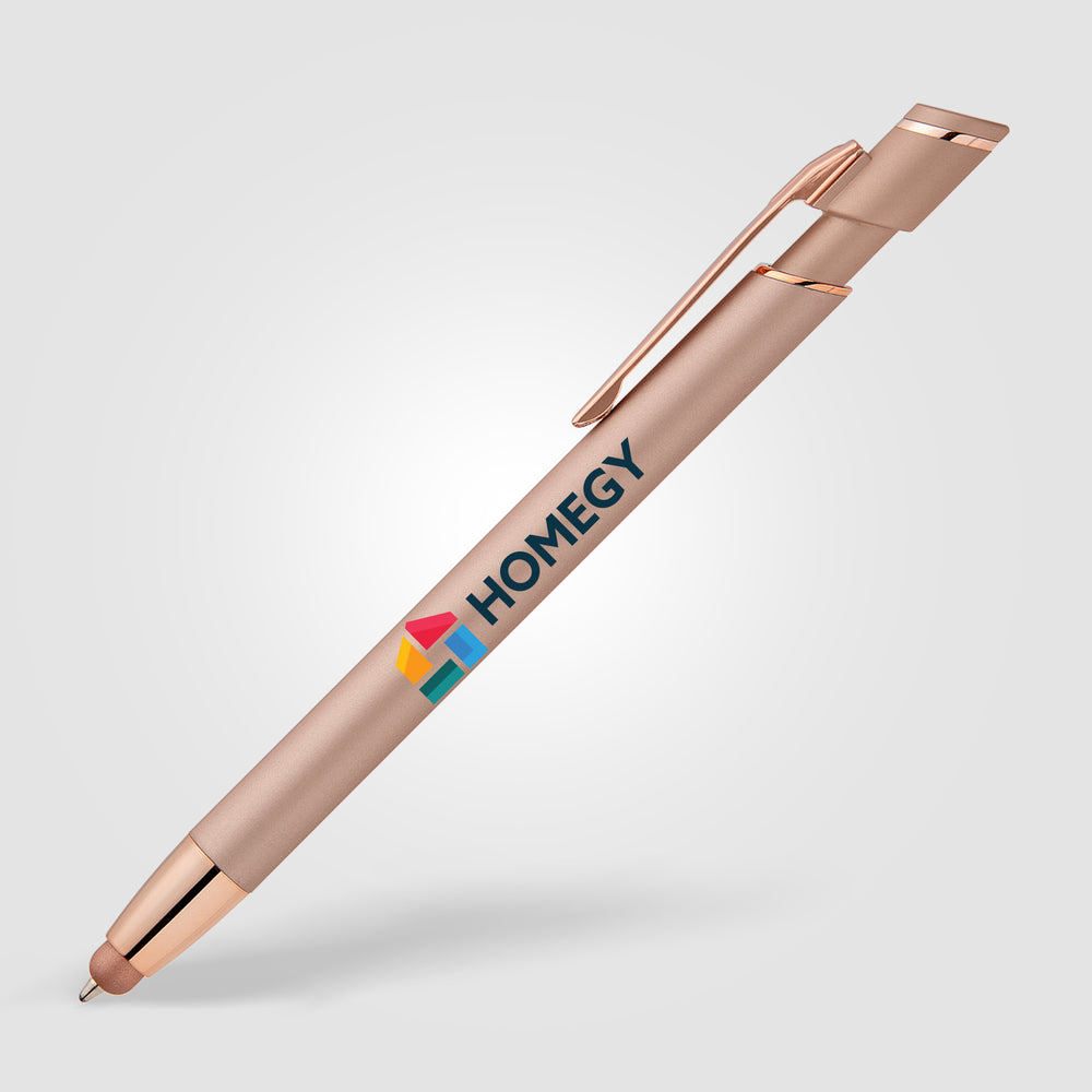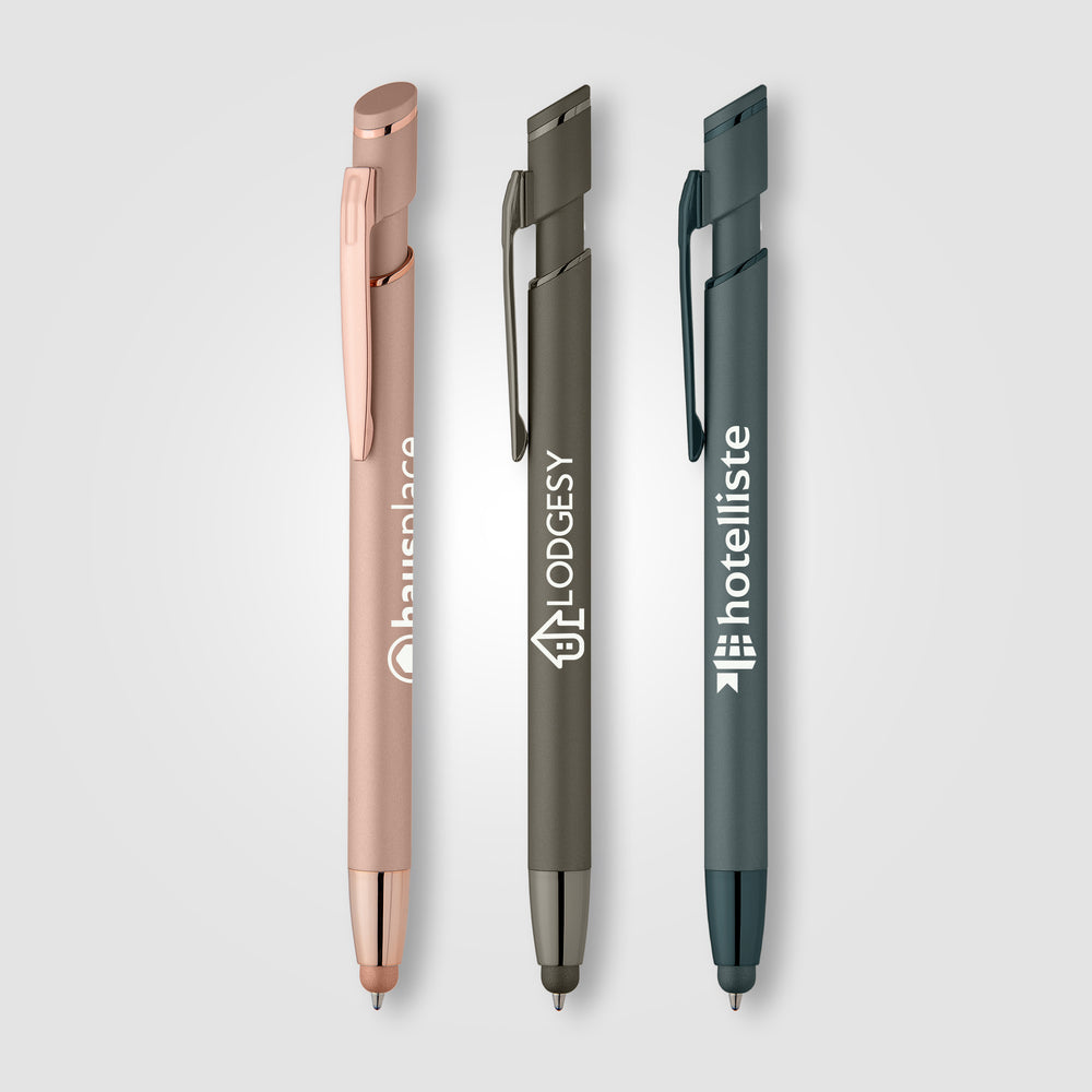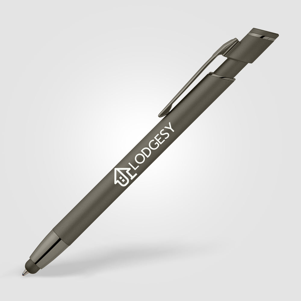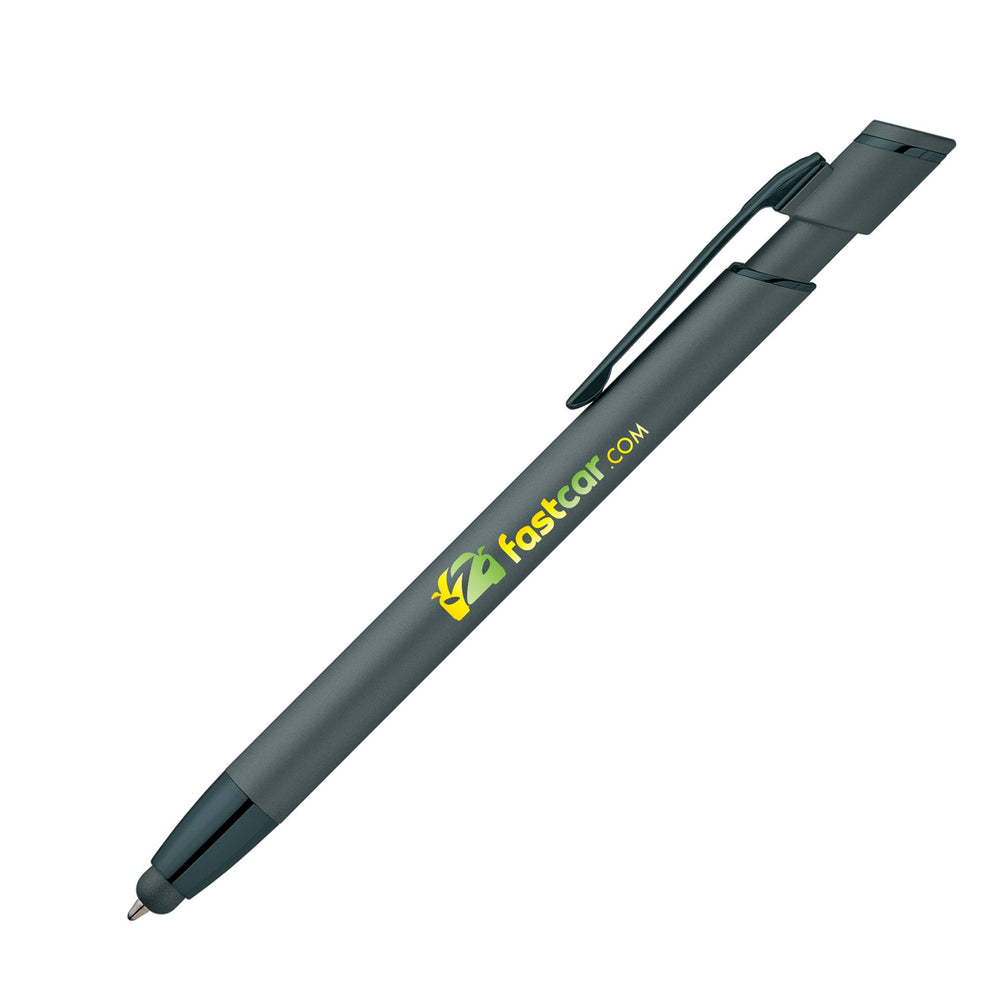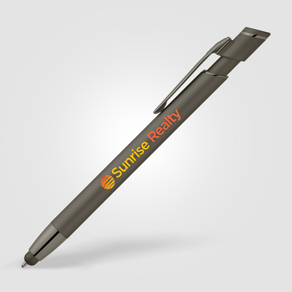 The Pacific Softy Metallic metal pen features a contemporary monochromatic design, with luxurious soft-touch barrels complementing color-matched metallic trim for a fresh, modern look.  The capacitive nose stylus adds useful touchscreen functionality.  Customize with your logo for an impressive branded pen.