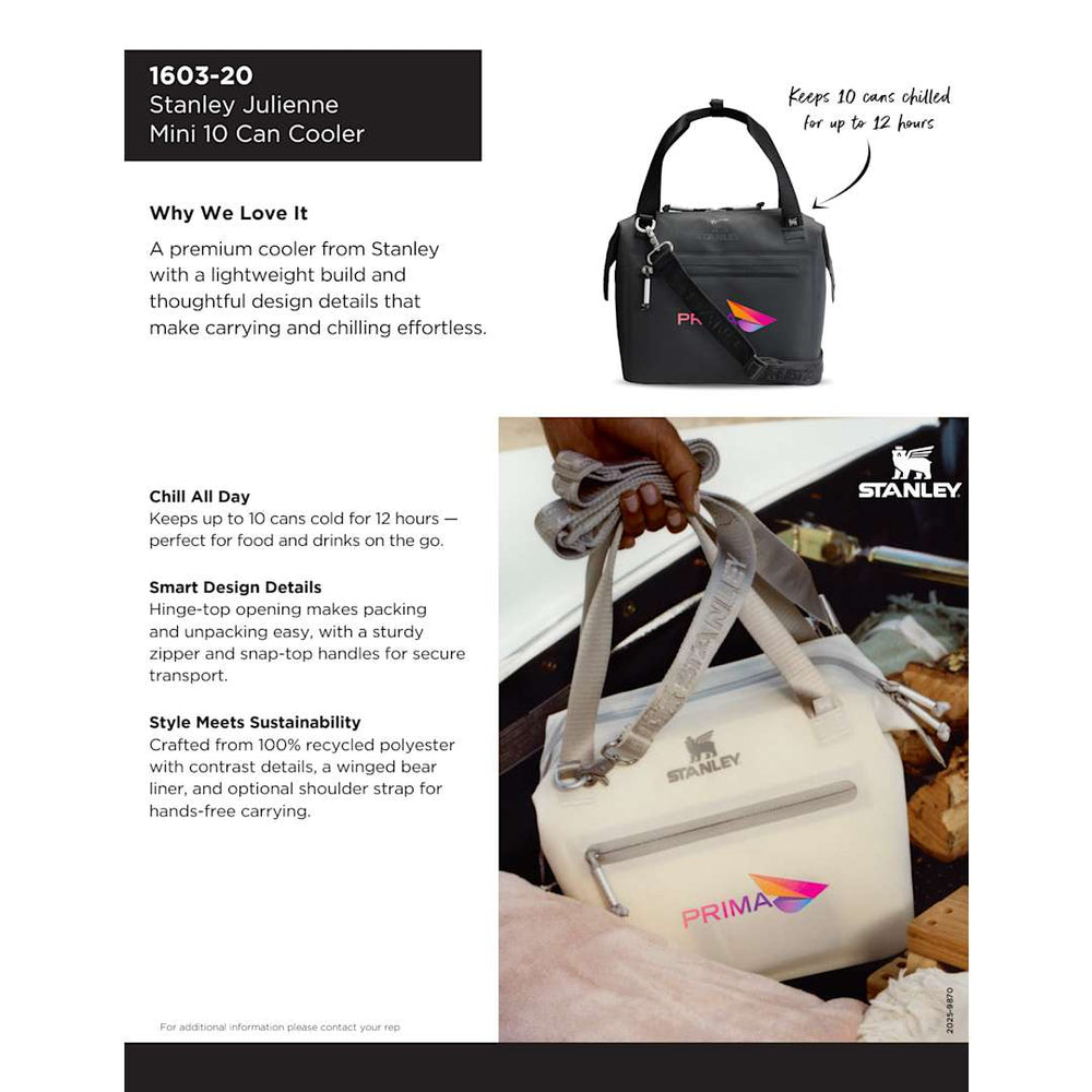 The Stanley All Day Julienne Mini 10 Can Cooler is made from 100% recycled polyester to make dining outside more sustainable. These vibrant coolers with contrast details, and a patterned winged bear liner, hold all you need for picnic dates, city hikes, and weeknights with friends. Head outside to soak up the fun and recharge. With a 10-can storage capacity, the All Day Julienne Mini Cooler keeps your goods nice and cool for 12 hours. The unique “doctor’s bag” hinge top pops open to help with unpacking. Load up with reusable ice packs, pop it shut and the sturdy zipper keeps things safely stored. The snap-top handles have a comfortable grip, while a zippered pocket protects your valuables. There’s also the option to attach the strap to sling the cooler over your shoulder. From acai bowls to charcuterie, sparkling beverages and wine are ready to be enjoyed. Don’t forget to pack all your favorite snacks and drinks in Stanley style.