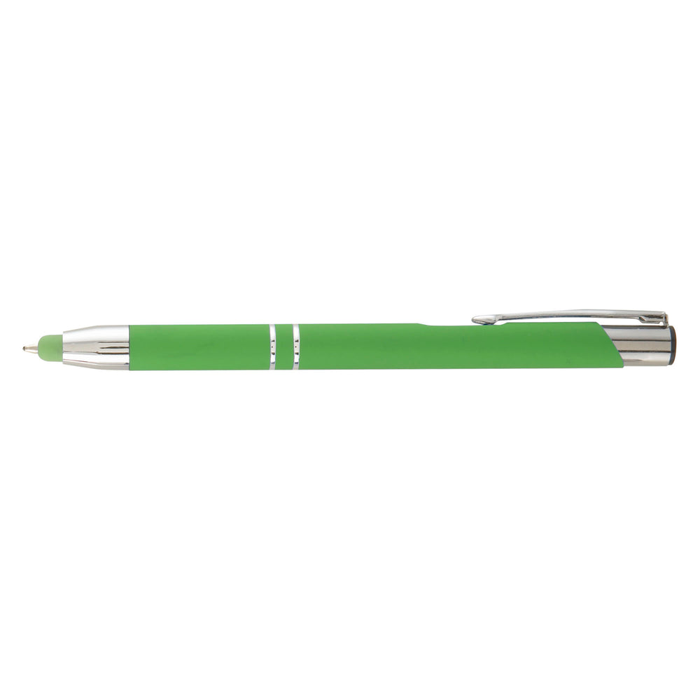 Make a strong connection with new and potential clients using the Tres-Chic Softy Brights with Stylus! This medium ballpoint metal pen has black ink and has seven bright colors to choose from. An assortment of colors is also available. It features a soft touch body, chrome trim with accent rings and your company's imprint. Your tech customers will get a kick out of using this pen to write and then to navigate apps on their phones or other electronics that can be used with a stylus. Add some variation to your advertising campaign!