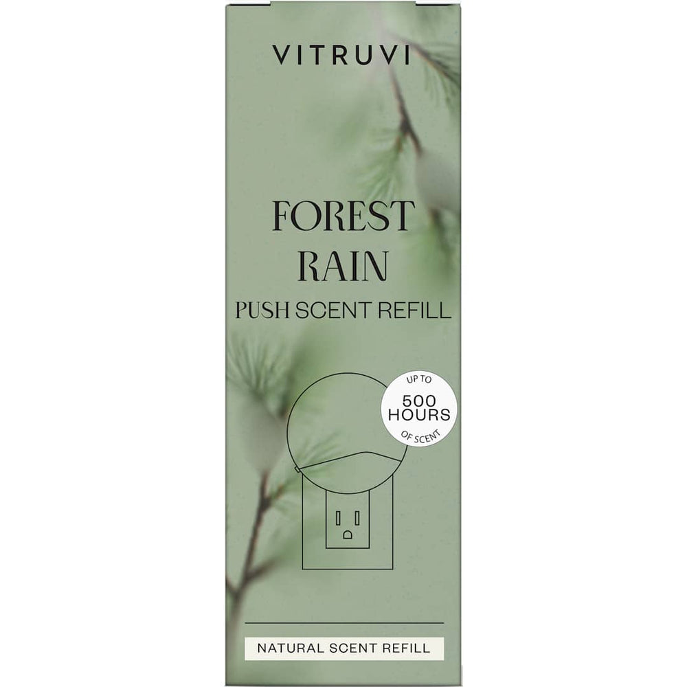 Meet the effortless way to naturally scent your space with no cords and no mess with the Vitruvi Push Plug-In Wall Diffuser. Designed to fit into any space, this wall diffuser effortlessly scents any room for up to 500 hours. Control the intensity of your scent with adjustable settings to suit your preferences. This set includes one scent refill in Forest Rain.