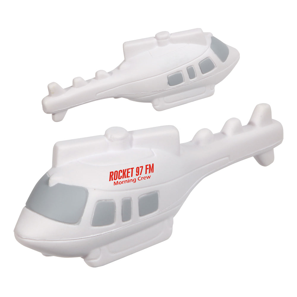 Helicopter shaped polyurethane stress reliever.. White stress relievers may discolor over time. Please store them in their plastic bags away from direct sunlight and distribute within 3 months.