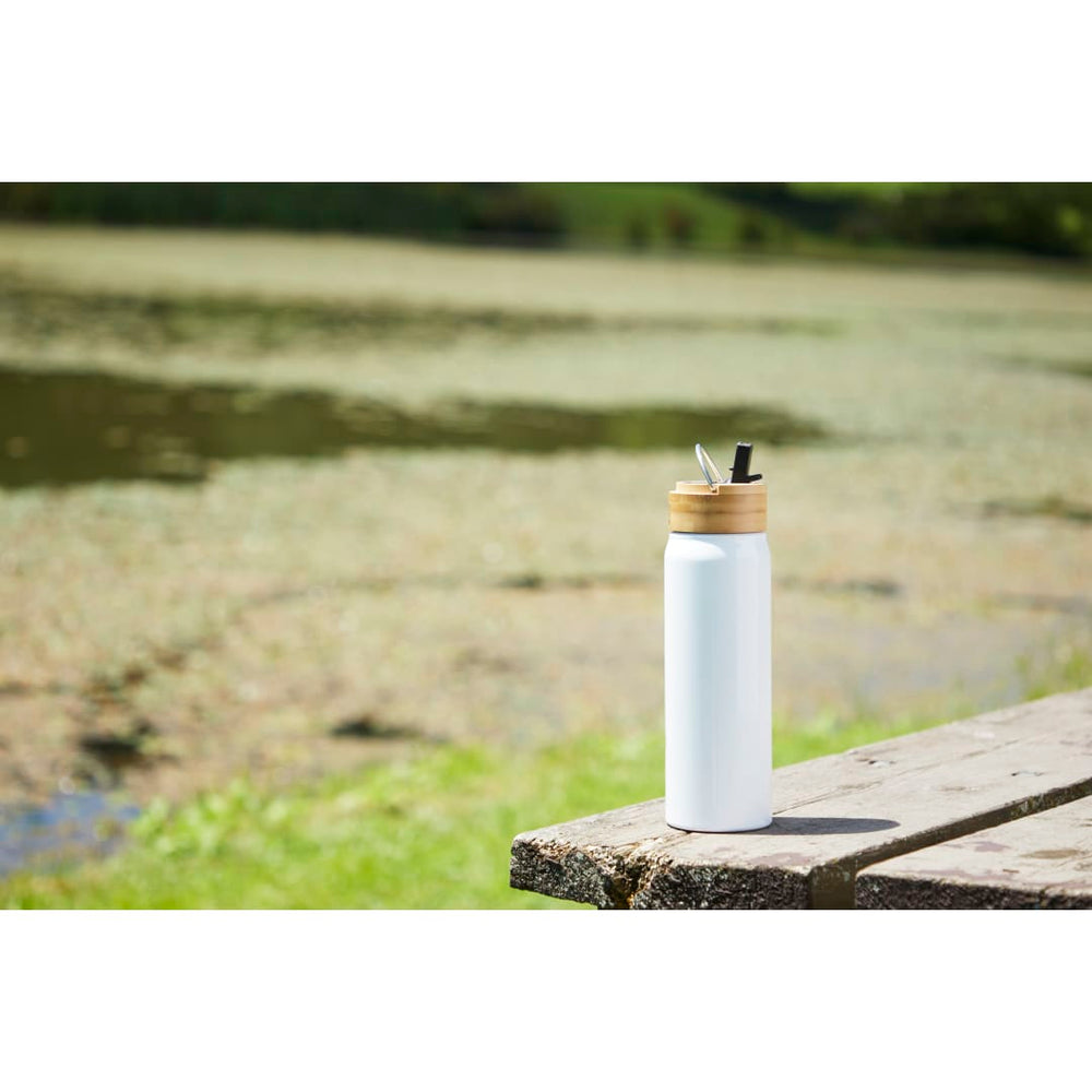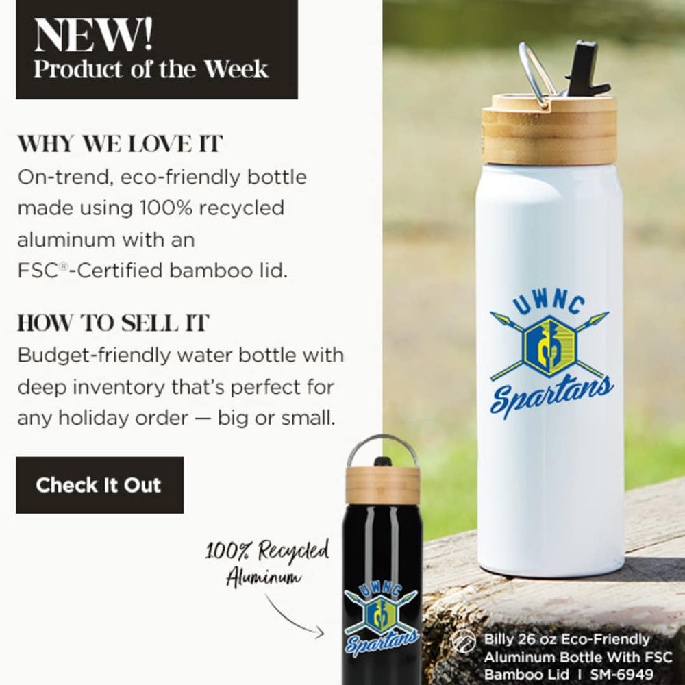 The Billy ECO Aluminum Bottle 26oz is constructed from 100% post-consumer recycled Aluminum material. It features a screw-on, spill-resistant FSC certified bamboo lid with the flip top integrated straw with wide opening for easy cleaning & refill included durable stainless steel hand loop. The exterior has a trendy glossy finish. This 26oz sports bottle is hand wash only, fits most standard cup holders.