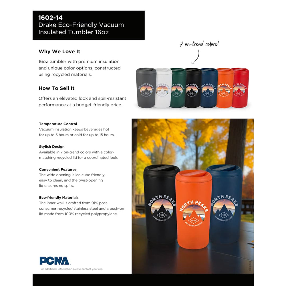 The Drake Vacuum Insulated Tumbler 16oz features double-wall construction designed to keep beverages hot for up to 5 hours or cold for up to 15 hours. With a condensation-resistant exterior, push-on 100% recycled polypropylene lid with twist opening closure, and easy-to-clean wide opening, this 16oz tumbler is designed for convenience. It comes with the trendy color drenching look. The liner is made from 91% post-consumer recycled 18/8 stainless steel with vacuum insulation. Hand wash only. PCNA exclusive. 16oz