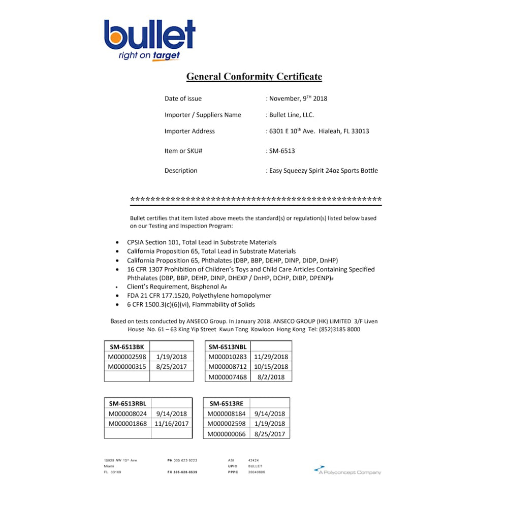 The Easy Squeezy Spirit 24-ounce Sports Bottle is a Made in USA, BPA-free sports bottle that's made with polypropylene material. It features a twist-on lid with a push/pull drinking spout and a bottle color that matches its lid color. Phthalate-free, Non-Toxic and Lead-free it meets FDA Requirements. Bottles and lids are also shipped separately (lids not attached). Hand wash only and follow any included care guidelines.