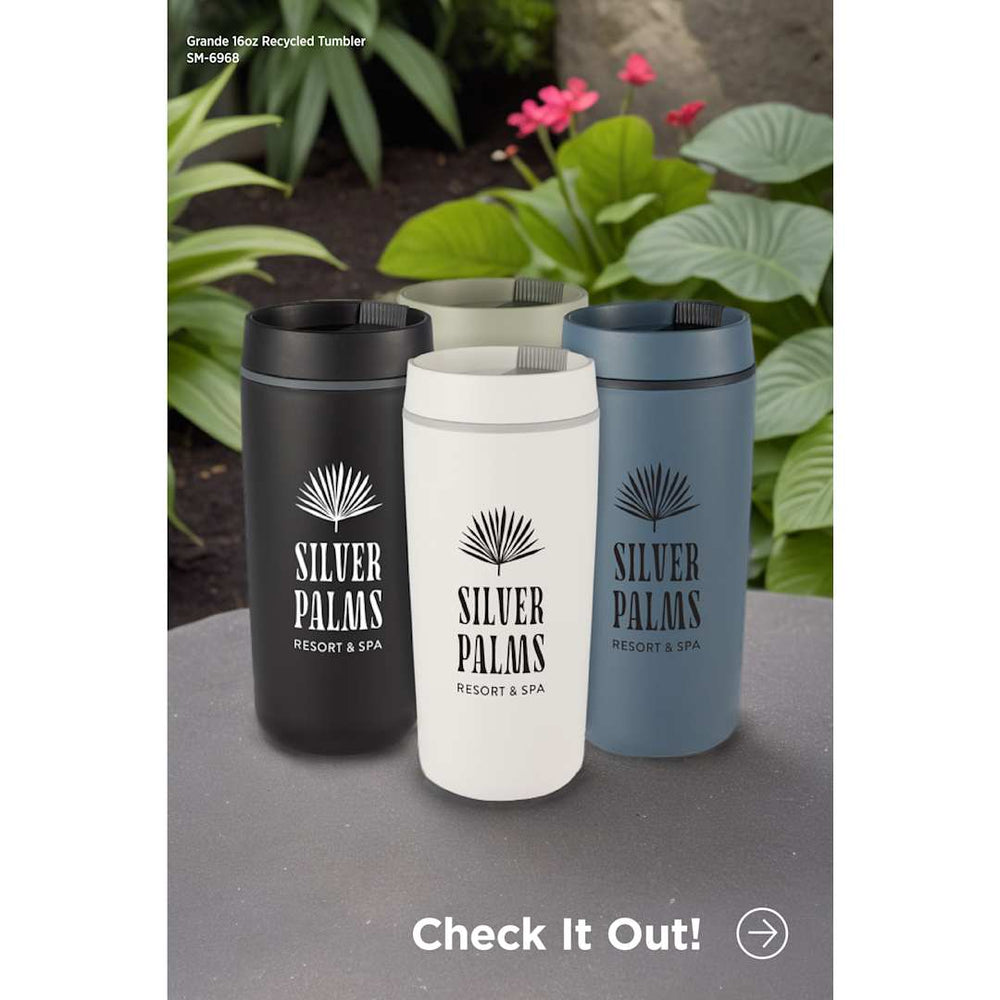The Grande Tumbler is a 16oz, recycled travel companion crafted entirely from 100% recycled plastic. Its air-insulated, double-wall construction helps maintain the temperature of your favorite hot or cold beverages in any environment. The screw on lid features a slide-lock opening, allowing for easy sipping on the go. Designed for durability and everyday use, this tumbler is the perfect blend of style and function. Hand wash only.