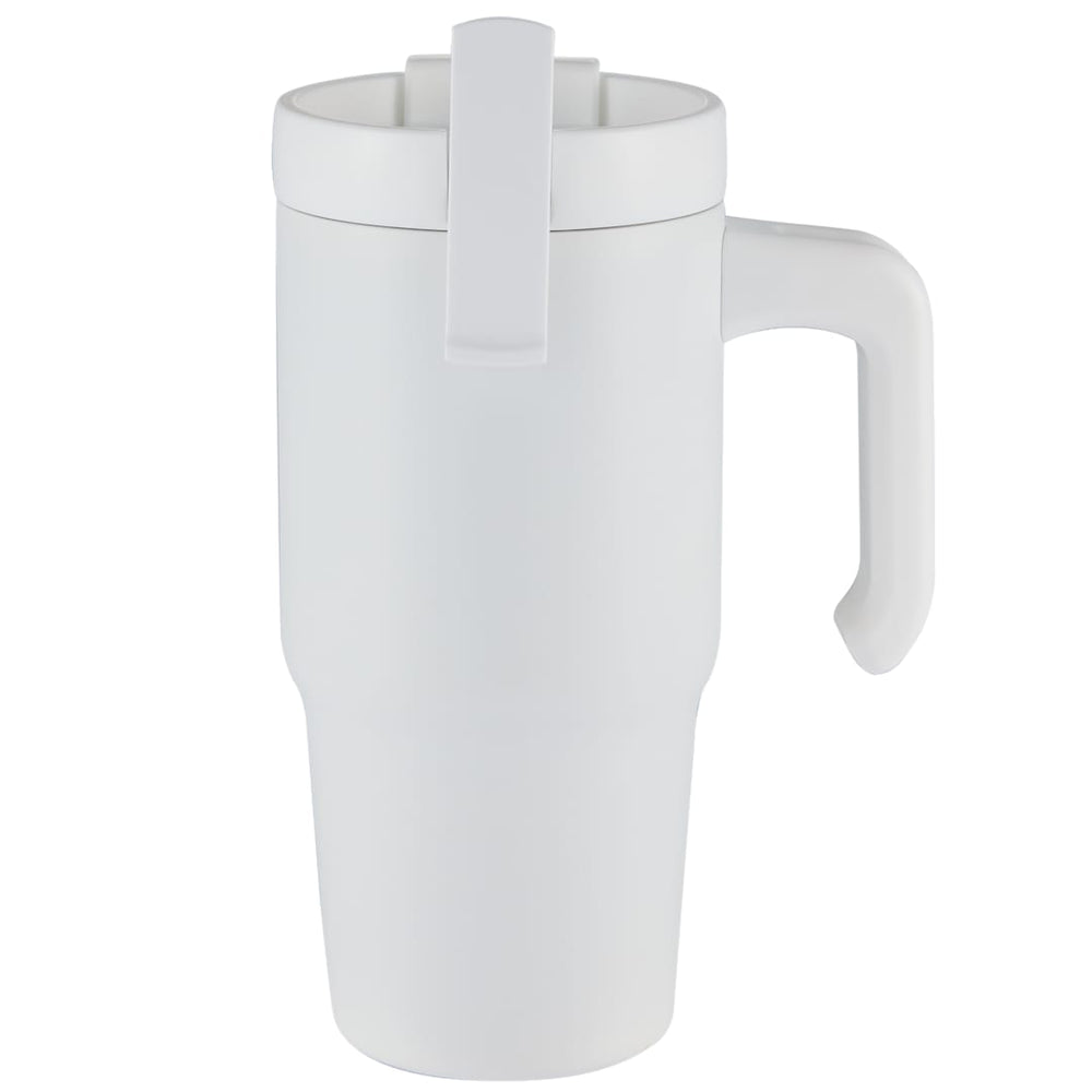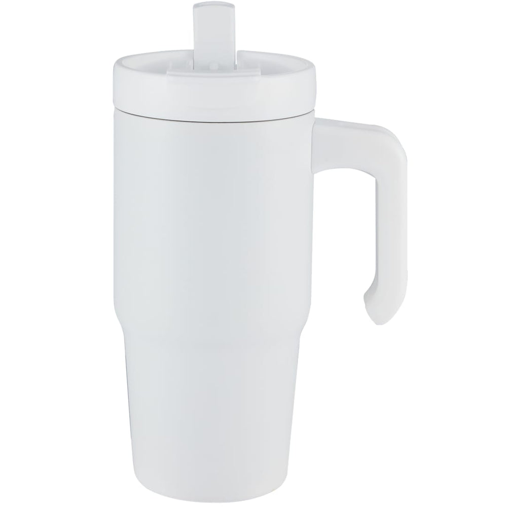 The Peak 24oz Mug is designed to be fully functional for both hot and cold beverages. Its built-in flip straw offers convenient, effortless sipping. Snap the straw shut, and you can chug from the flap-open spout! It includes a cozy handle which provides on-the-go convenience. It is constructed using 91% post-consumer recycled 18/8 stainless steel plus all the other recycled plastic but having no compromise on style or performance at all. Durable, double-wall stainless steel vacuum construction with copper insulation allows your beverage to stay cold for up to 48 hours and hot for 12 hours. The construction also prevents condensation on the outside of the tumbler. On-trend, durable powder coating. Wide opening for easy filling and pouring - perfect for ice cubes. Fits most standard car cup holders. 24oz. Note: Drinking hot beverages with the straw is not recommended. Remove lid to allow beverage to cool. Hand wash