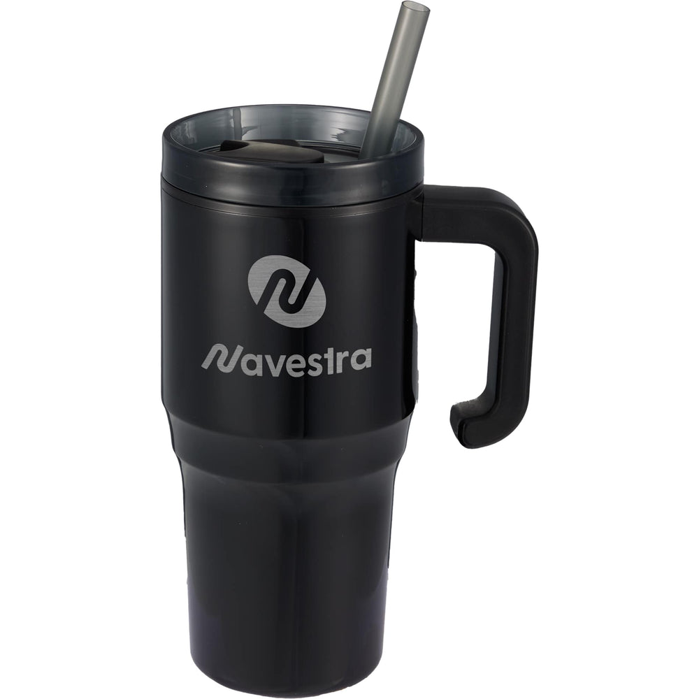 The Bullet Thor 20 oz Eco-Friendly Straw Tumbler features durable double-wall construction to keep your beverages hot or cold in any environment. Food-grade recycled straw included for easy reuse daily. The Thor features a slim base that fits into most cupholders, comfortable carry handle, and splash-proof press-on lid with two openings and a swivel closure, friendly to both Sippers and Chuggers! Hand-wash only.