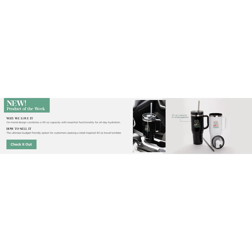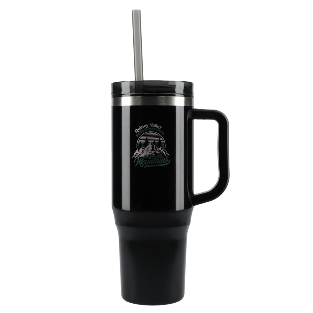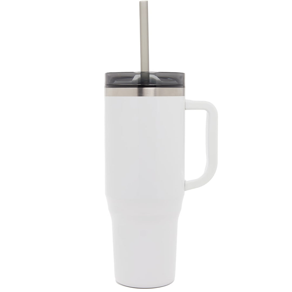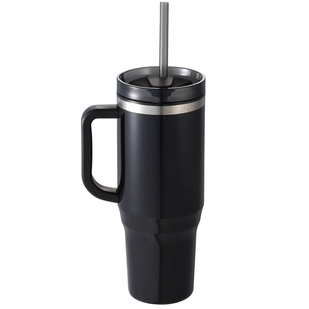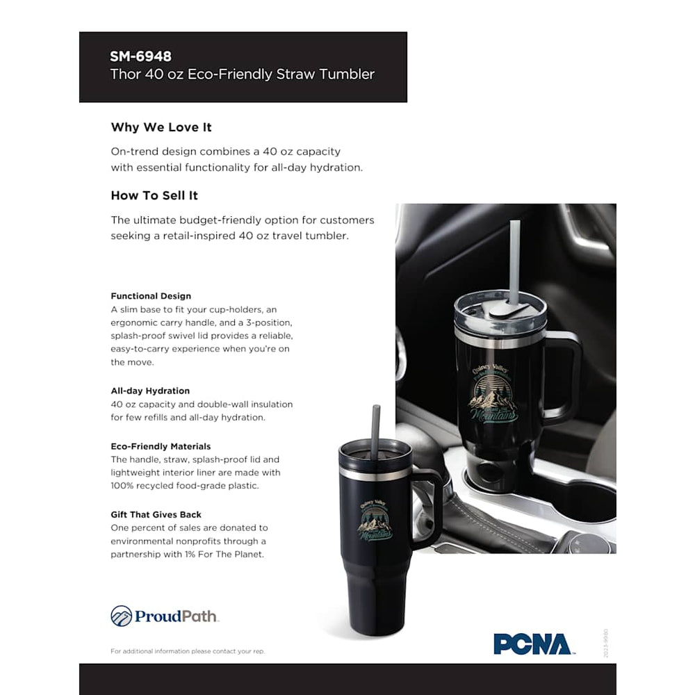 The Bullet Thor 40 oz Eco-Friendly Straw Tumbler features durable double-wall construction to keep your beverages hot or cold in any environment. Food-grade recycled straw included for easy reuse daily. The Thor has a 40 ounce capacity for fewer refills and features a slim base that fits into most cupholders, comfortable carry handle, and splash-proof press-on lid with two openings and a swivel closure, friendly to both Sippers and Chuggers! Hand-wash only.