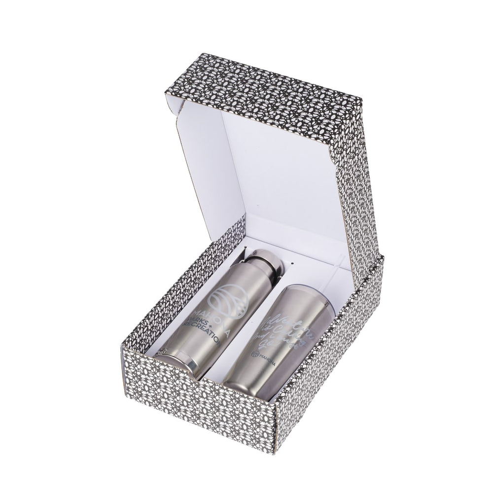 Great choice! Includes the Thor bottle 1625-85 22oz and Thor Tumbler 1626-50 22oz. Durable, double-wall stainless steel vacuum construction with copper insulation, which allows your cold beverage to stay cold for 24 hours and hot for at least 6 hours. The construction also prevents condensation on the outside of the piece. Leed's Exclusive. Gift box is not decorated. There might be a tiny color variance across the components in a set. “For additional protection, all Drinkware pieces will be individually polybagged and inserted in the gift box.”