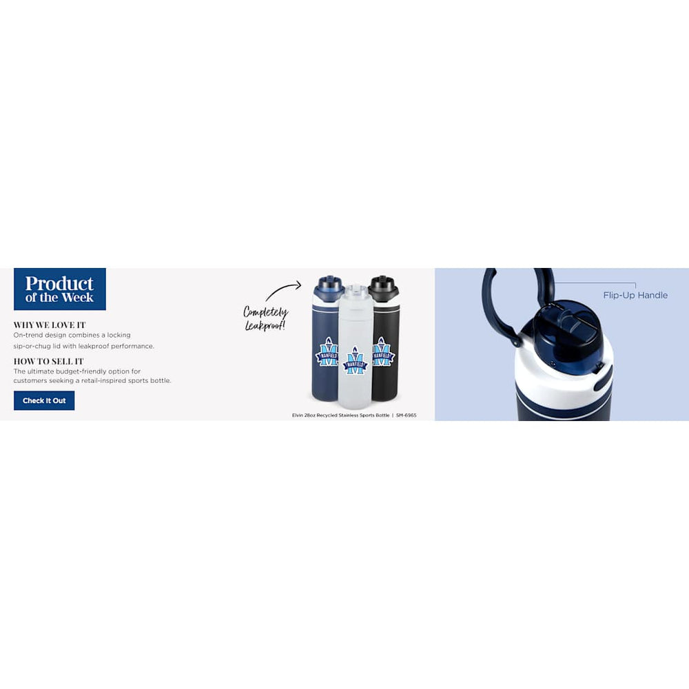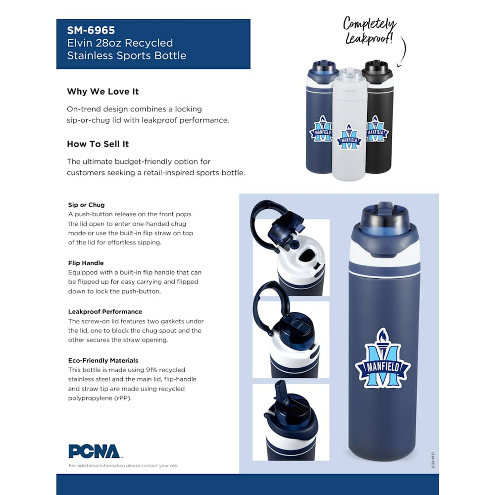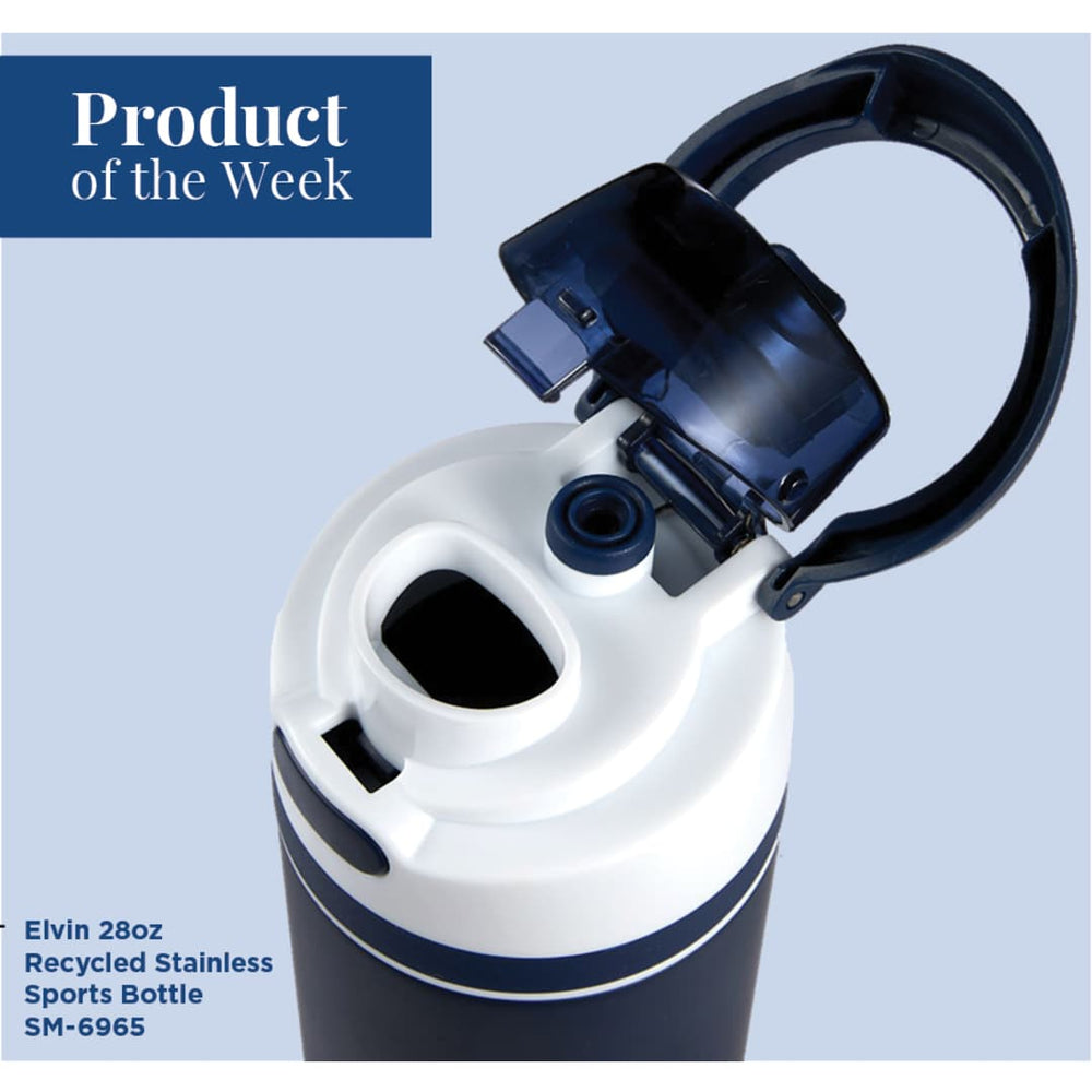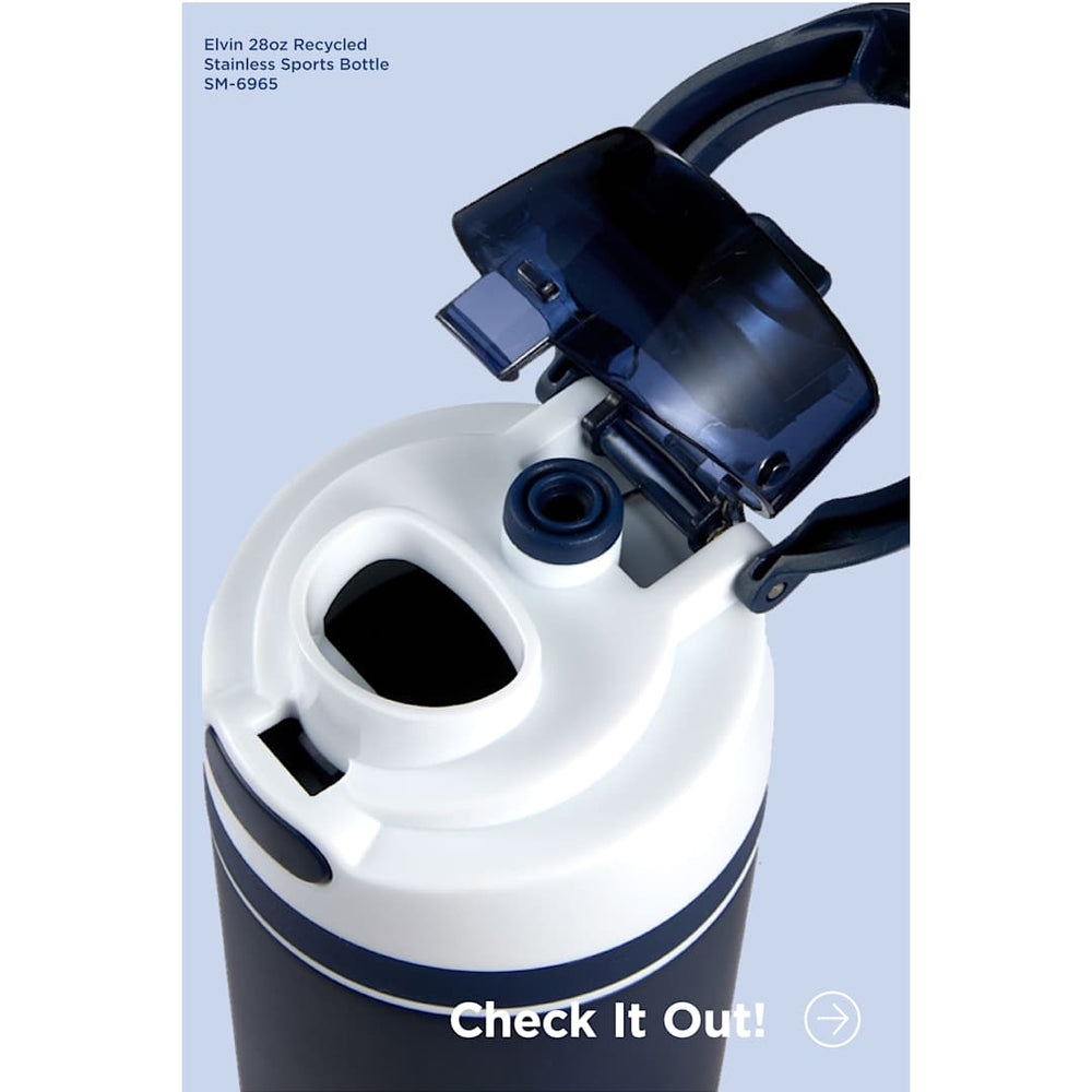 Elvin 28oz Recycled Stainless Steel Sports Bottle is multifunctional, sustainable drinkware at its best. Featuring a built-in flip straw on top of the lid for easy and effortless one-handed sipping. Snap the straw shut and you can chug from the flap-open spout! Equipped with a built-in flip handle, that can be flipped up for easy carrying, and flipped down and out of the way when it's time to hydrate. Elvin is also made using recycled materials, so you can sip (or chug) in style, while reducing your impact on the plant! Featuring a single-wall 91% recycled stainless steel body and recycled polypropylene (rPP) main lid, flip-handle and straw tip. To keep your Elvin Stainless Sports Bottle in peak condition, we recommend hand-washing.