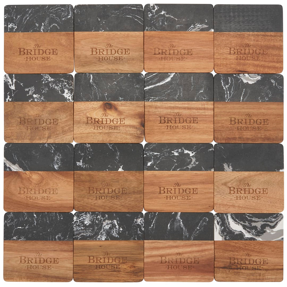 This on trend coaster set is crafted from marble and acacia wood. The coasters are square with rounded corners. These chic coasters are perfect for the home or office. Decoration on all four coasters. Due to the natural material variations in the marble pattern and laser imprint will occur.