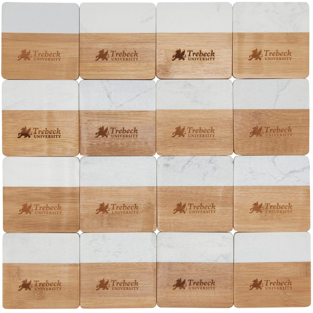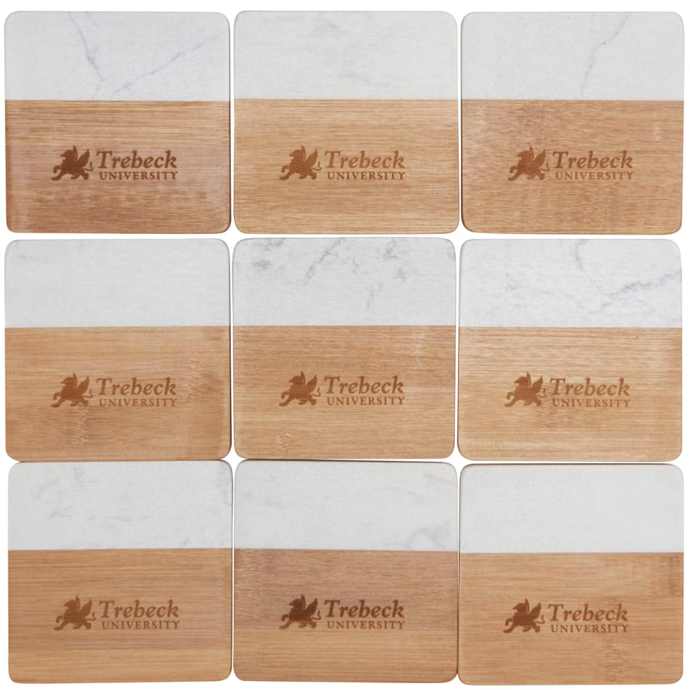 Each item in the four-piece Marble and Bamboo Coaster Set is square with rounded corners, perfect for your coffee table, office desk, or nightstand. Natural variations in the marble give each piece a unique, hand-crafted look, making these coasters truly one-of-a-kind. Due to the nature of the bamboo material, variations in laser imprinting quality may occur.