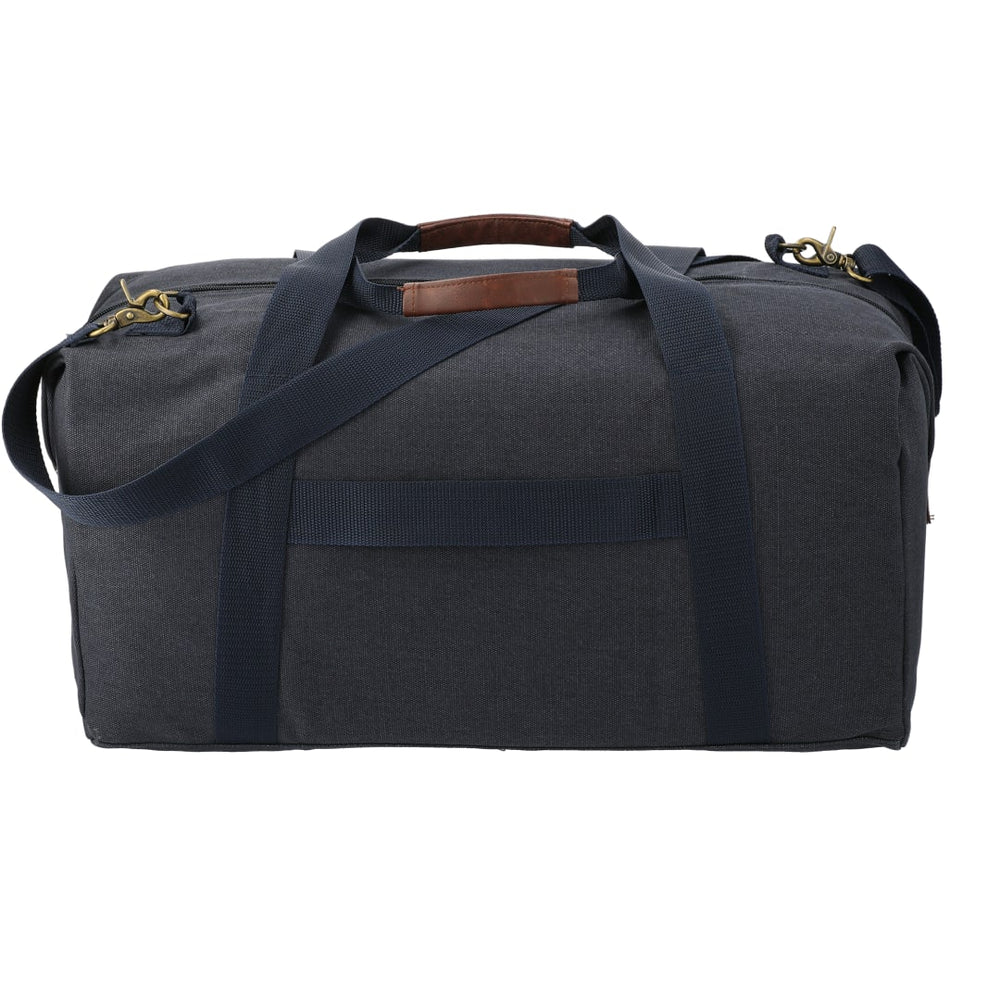 Made of cotton canvas, features a large main compartment and unique Field & Co.® details. Vinyl accents, front zippered pocket and durable handles. Sides can clip down when you are carrying less, or you can unclip the sides when the bag is fully stuffed. Also features trolley pass-through.