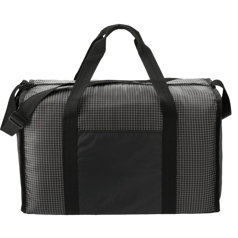 The Grid Boxy Duffel features a roomy zippered main compartment, two carry handles, and an adjustable shoulder strap.