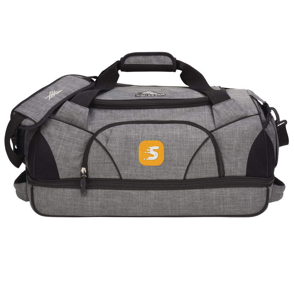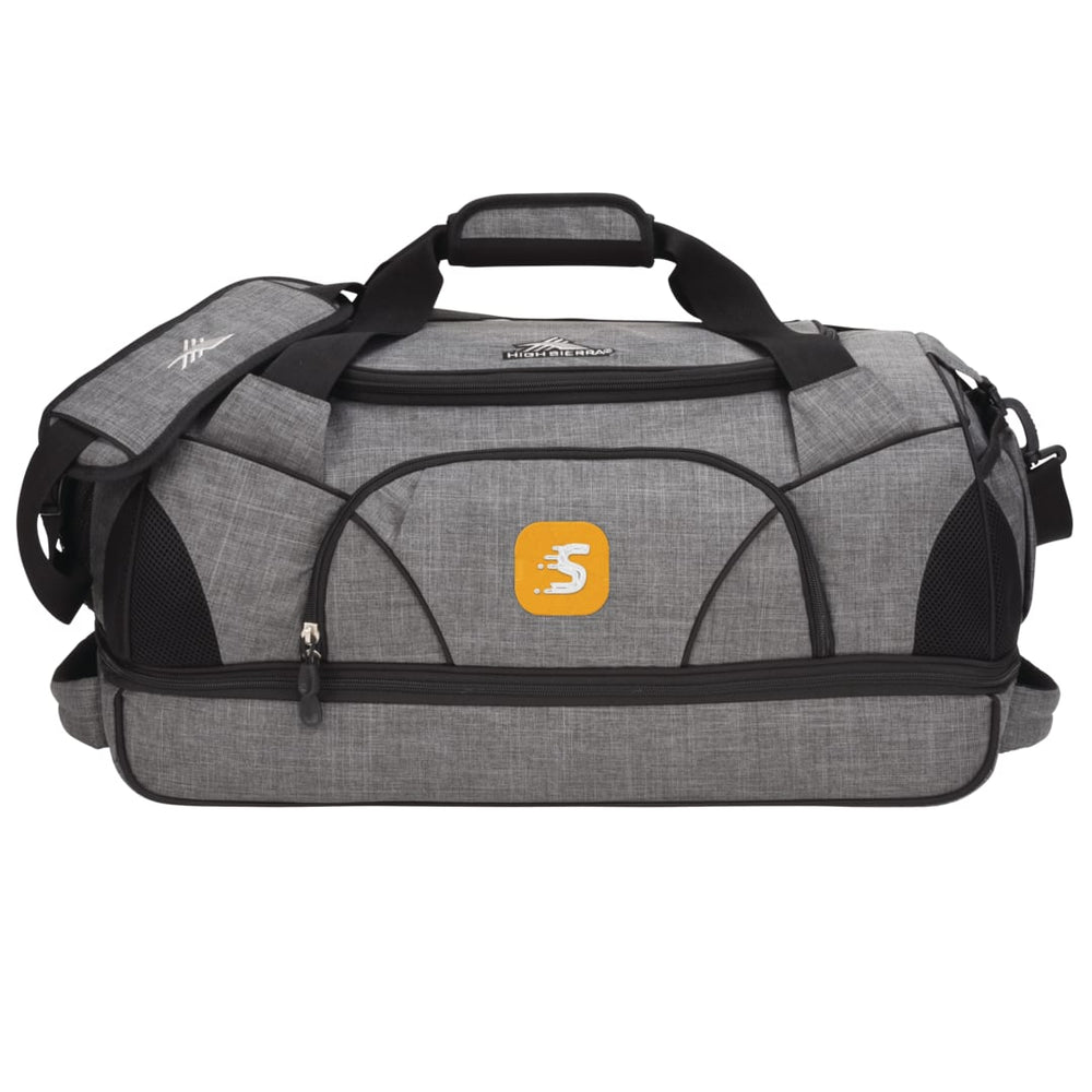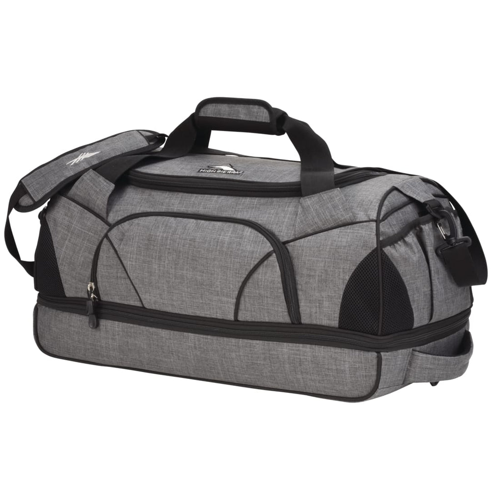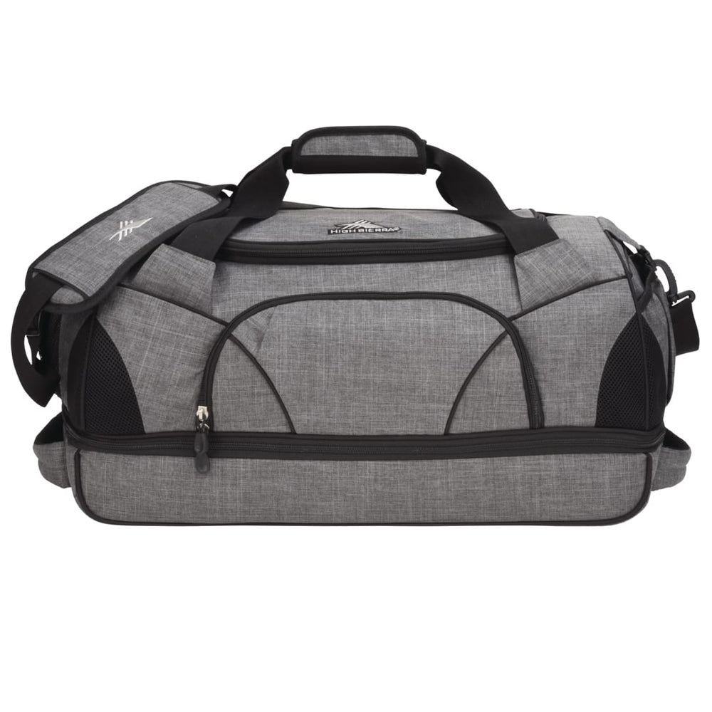 Zippered main compartment with U-shaped opening. Drop-bottom wet compartment with zippered divider panel opens to make one large compartment. Front pocket with deluxe organizer and headphone port. Water bottle and accessory pockets. Includes lifetime warranty.