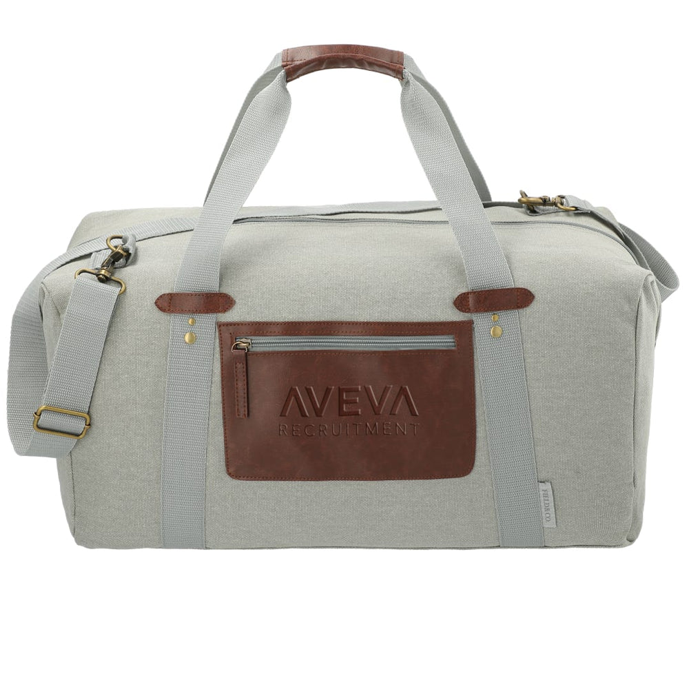Made of cotton canvas, features a large main compartment and unique Field & Co.® details. Vinyl accents, front zippered pocket and durable handles. Sides can clip down when you are carrying less, or you can unclip the sides when the bag is fully stuffed. Also features trolley pass-through.
