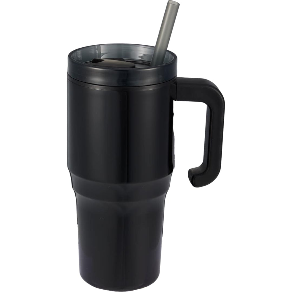The Bullet Thor 20 oz Eco-Friendly Straw Tumbler features durable double-wall construction to keep your beverages hot or cold in any environment. Food-grade recycled straw included for easy reuse daily. The Thor features a slim base that fits into most cupholders, comfortable carry handle, and splash-proof press-on lid with two openings and a swivel closure, friendly to both Sippers and Chuggers! Hand-wash only.
