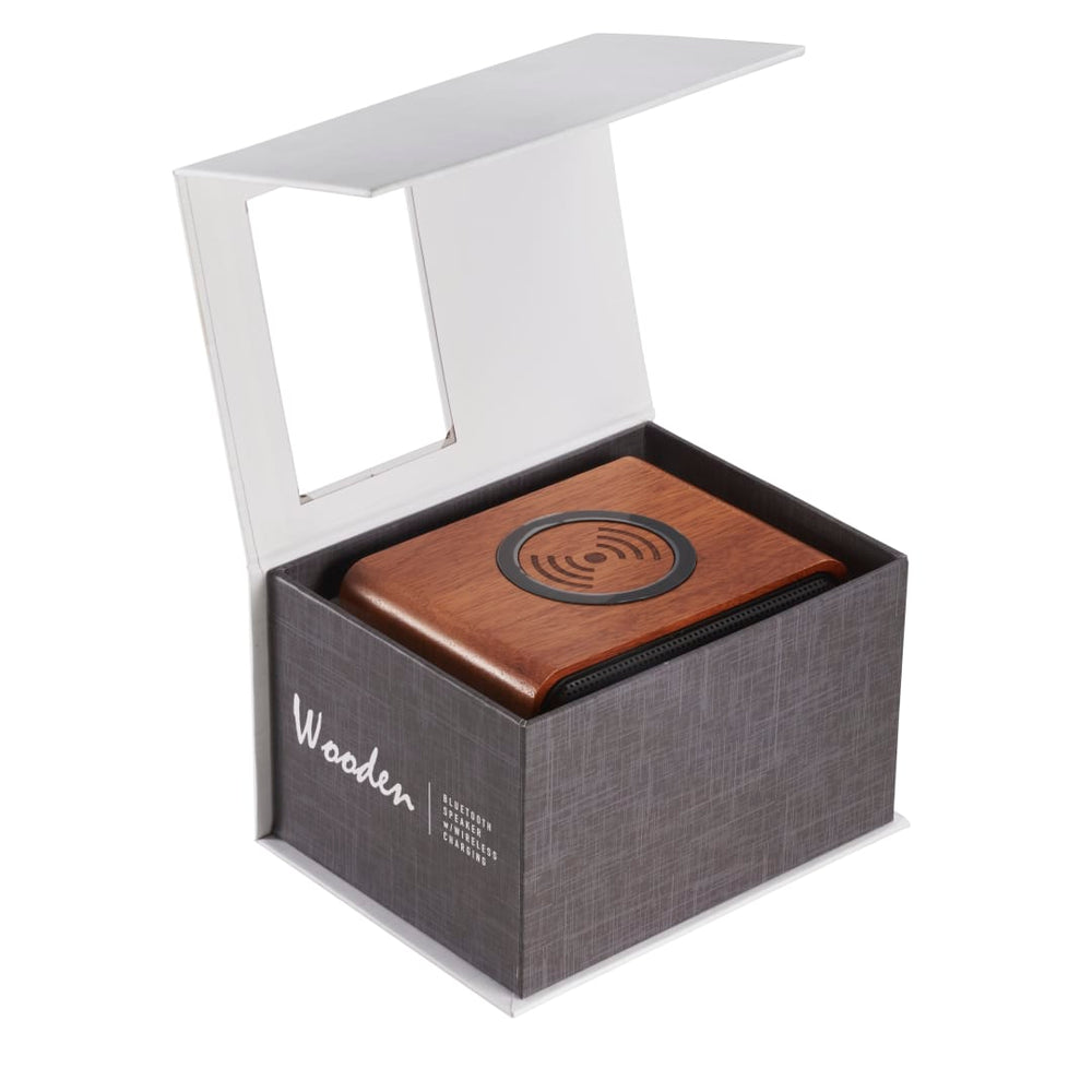 Enceinte Bluetooth en bois avec socle de recharge sans fil