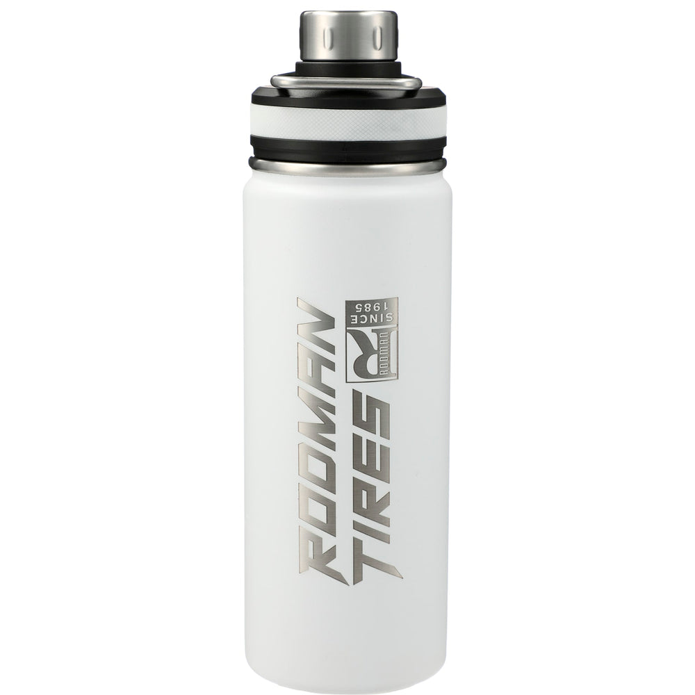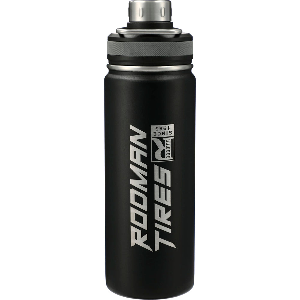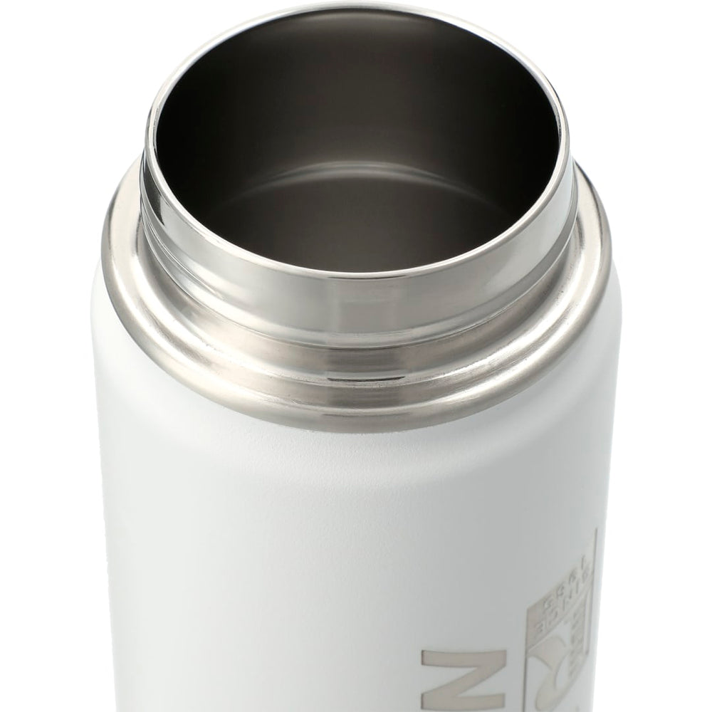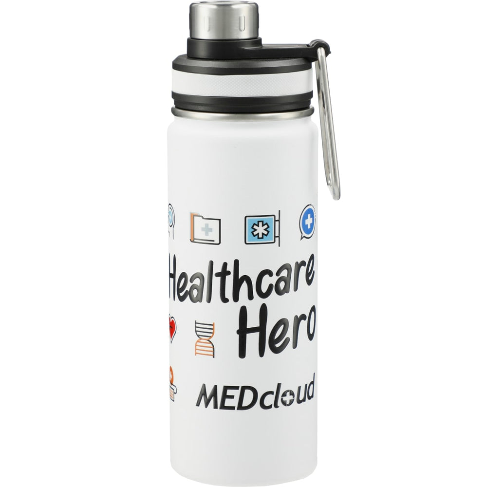 Durable, double-wall, stainless steel vacuum construction with copper insulation, which allows your beverage to stay cold for 48 hours and hot for at least 12 hours. The construction also prevents condensation on the outside of the bottle. On-trend, durable powder coating. Dual opening, screw-on, stainless steel cap on the main lid with silicone band. Also features a built-in, durable, metal handling loop. Wide opening for comfortable filling and pouring. Perfect for ice cubes. Fits most standard car cup holders. Leed's exclusive. 20oz.