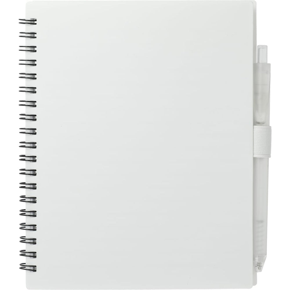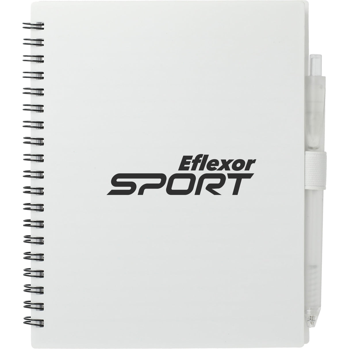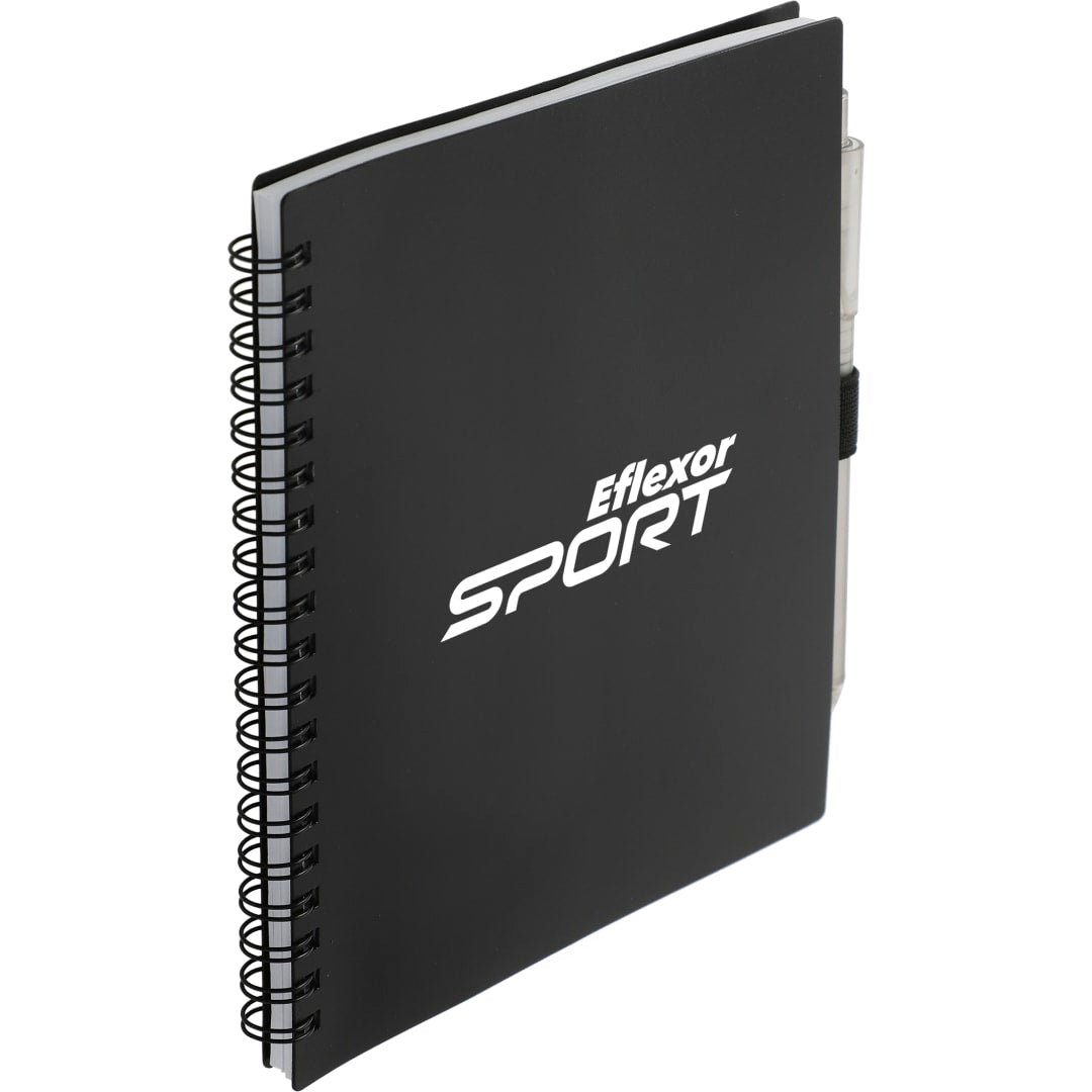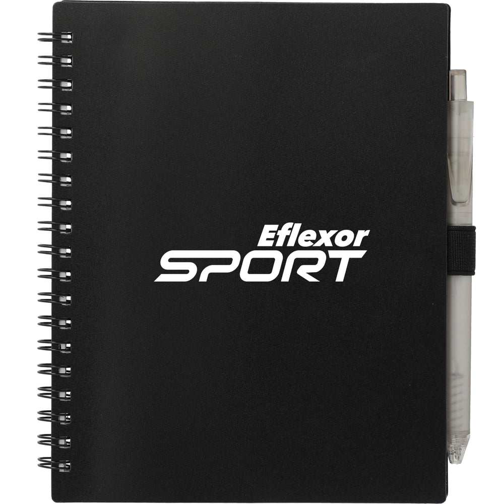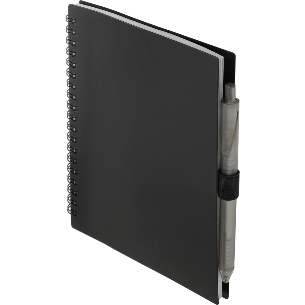 The 5.5” x 7” FSC Recycled Spiral Notebook w/ RPET Pen features a 100% recycled polypropylene, hard cover with 70 sheets of white lined FSC®-certified paper. Black metal wire binding paired with black elastic pen loop. Includes 100% RPET barrel pen with black ink cartridge. Through a partnership with 1% For The Planet, one percent of sales of all EcoSmart® products are donated to environmental nonprofits.