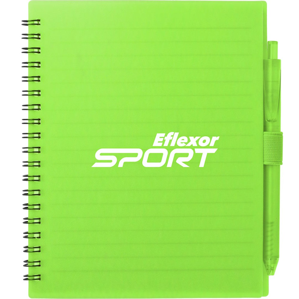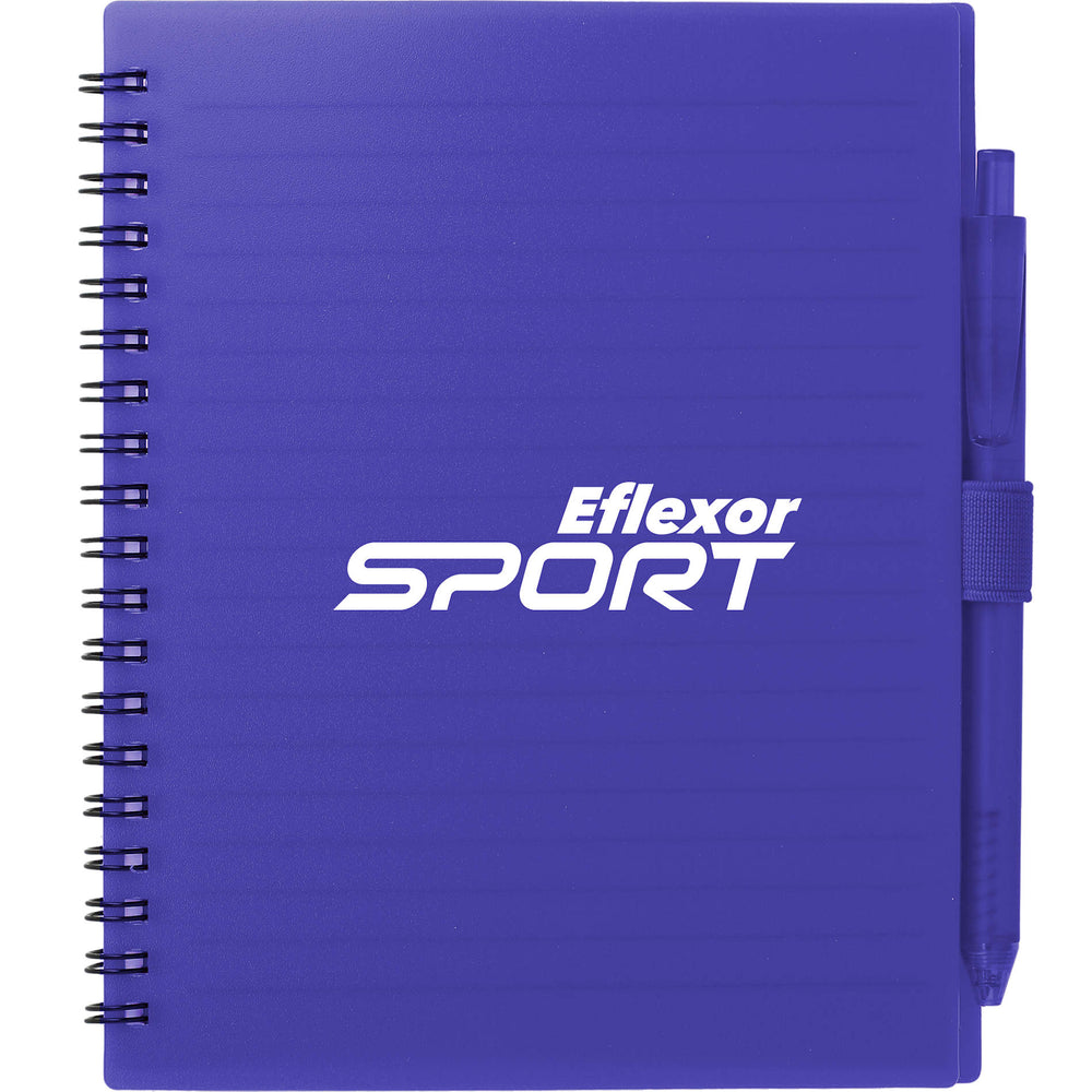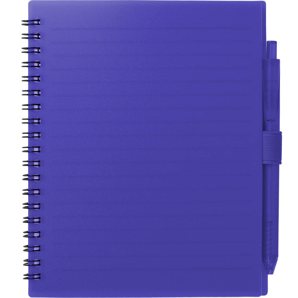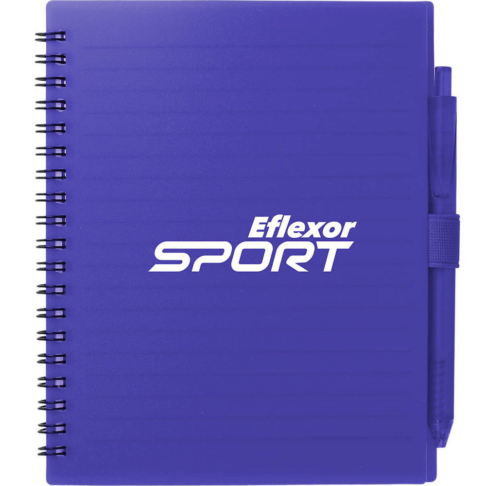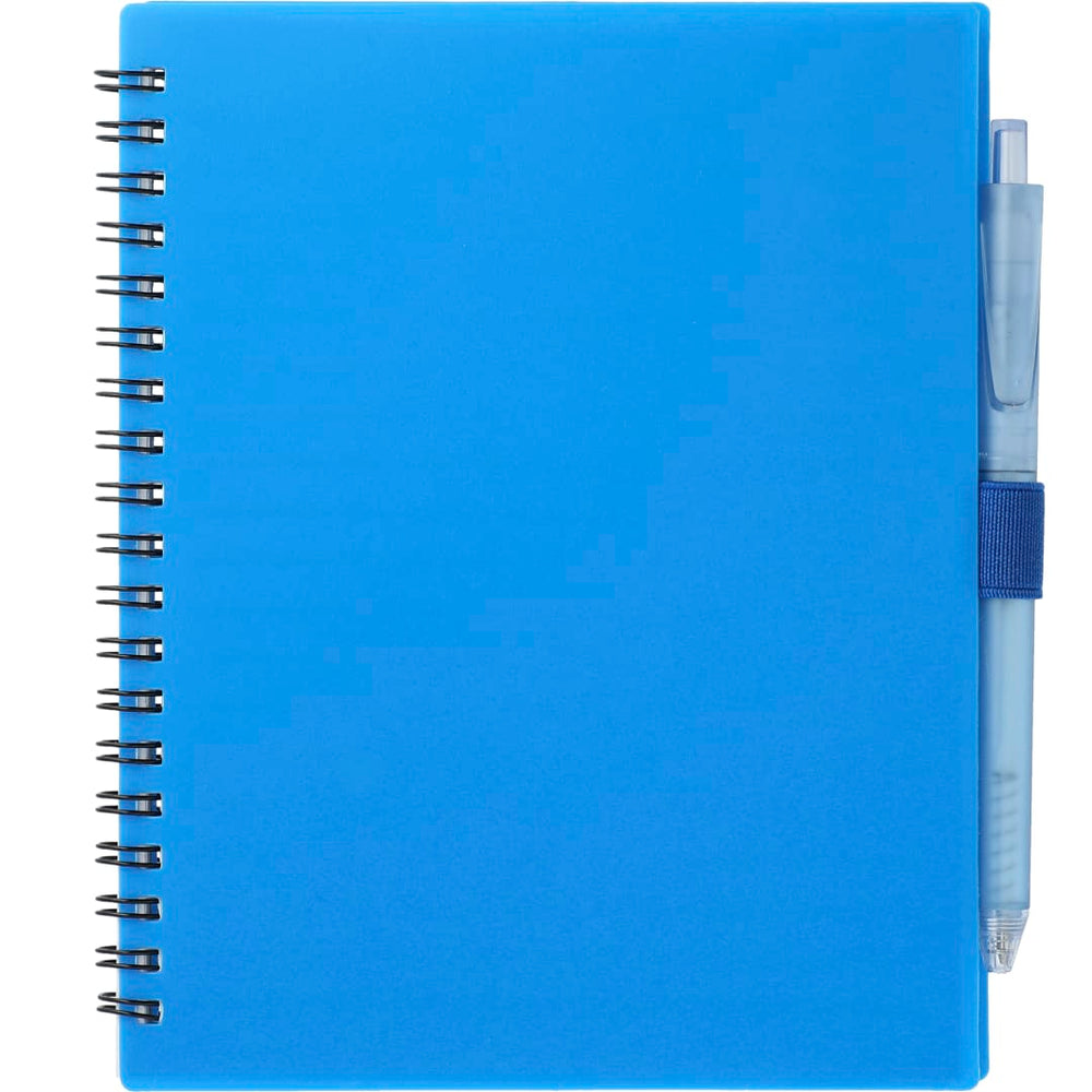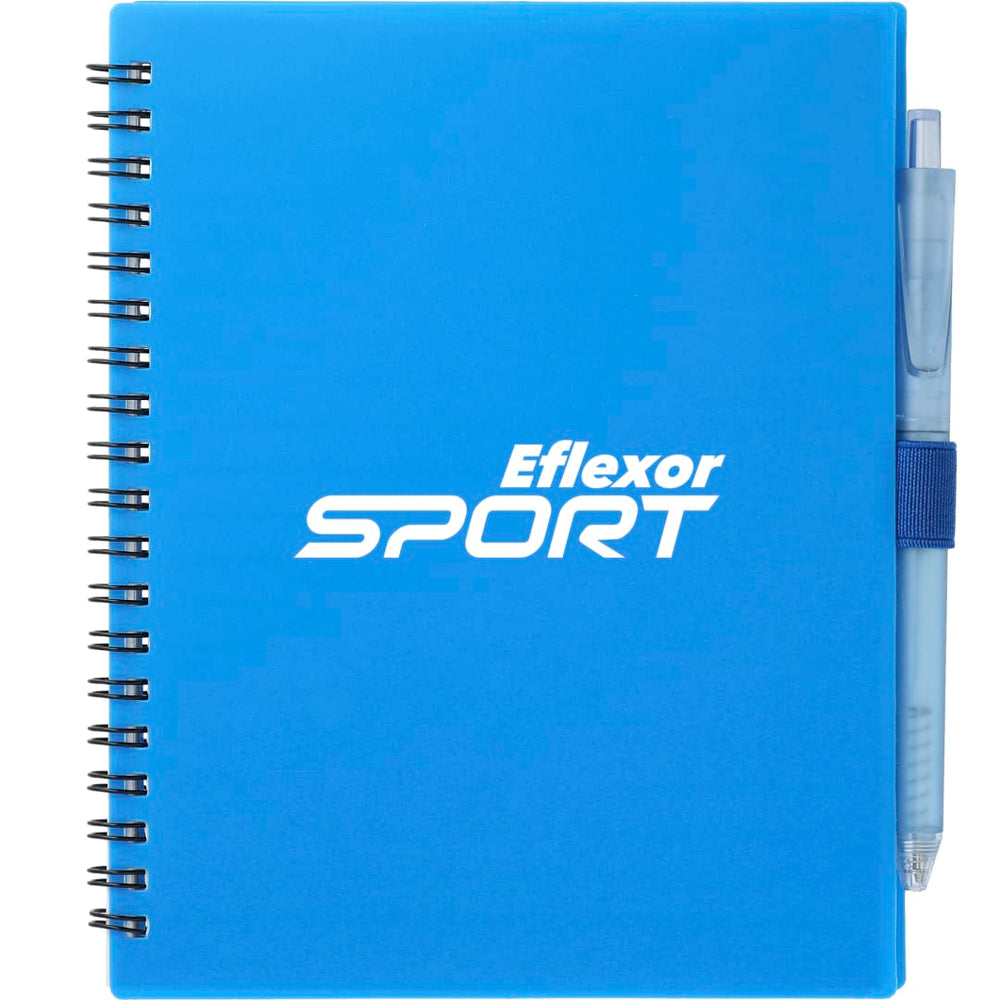 The 5.5” x 7” FSC Recycled Spiral Notebook w/ RPET Pen features a 100% recycled polypropylene, hard cover with 70 sheets of white lined FSC®-certified paper. Black metal wire binding paired with black elastic pen loop. Includes 100% RPET barrel pen with black ink cartridge. Through a partnership with 1% For The Planet, one percent of sales of all EcoSmart® products are donated to environmental nonprofits.