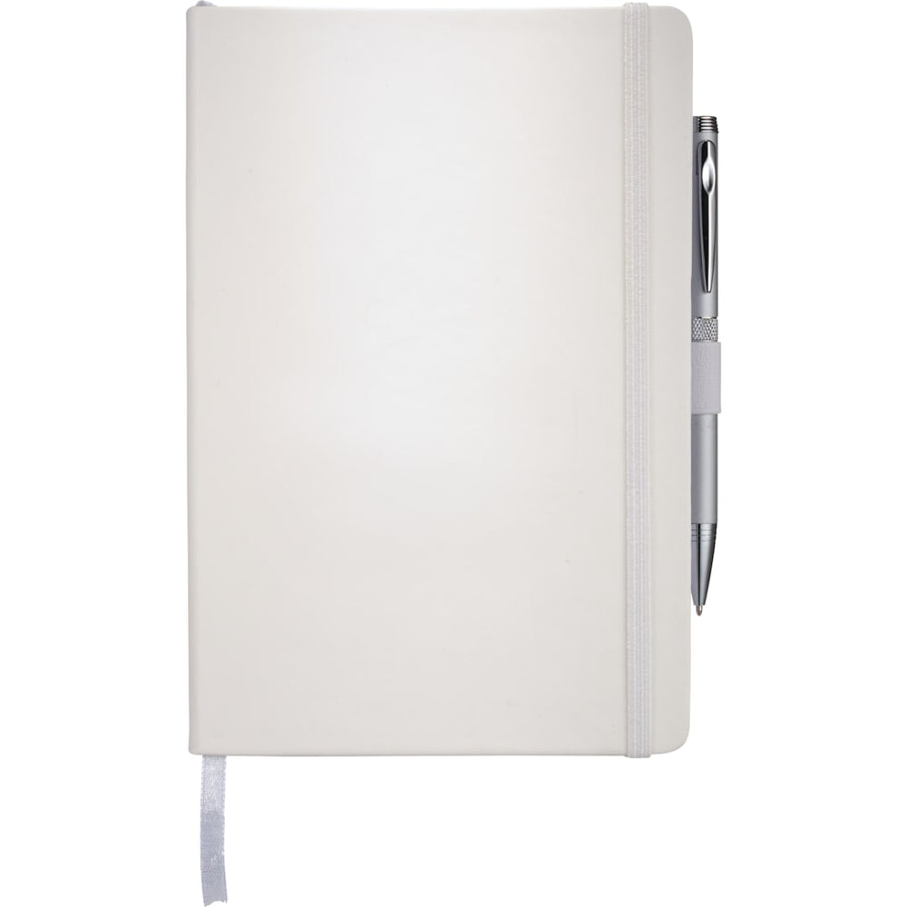 The 5.5" x 8.5" FSC Mix Nova Bound JournalBook® features a faux leather like, hard cover with built-in elastic closure, ribbon page marker, and expandable accordion pocket. Includes 96 sheets of lined white paper. Pen is not included.