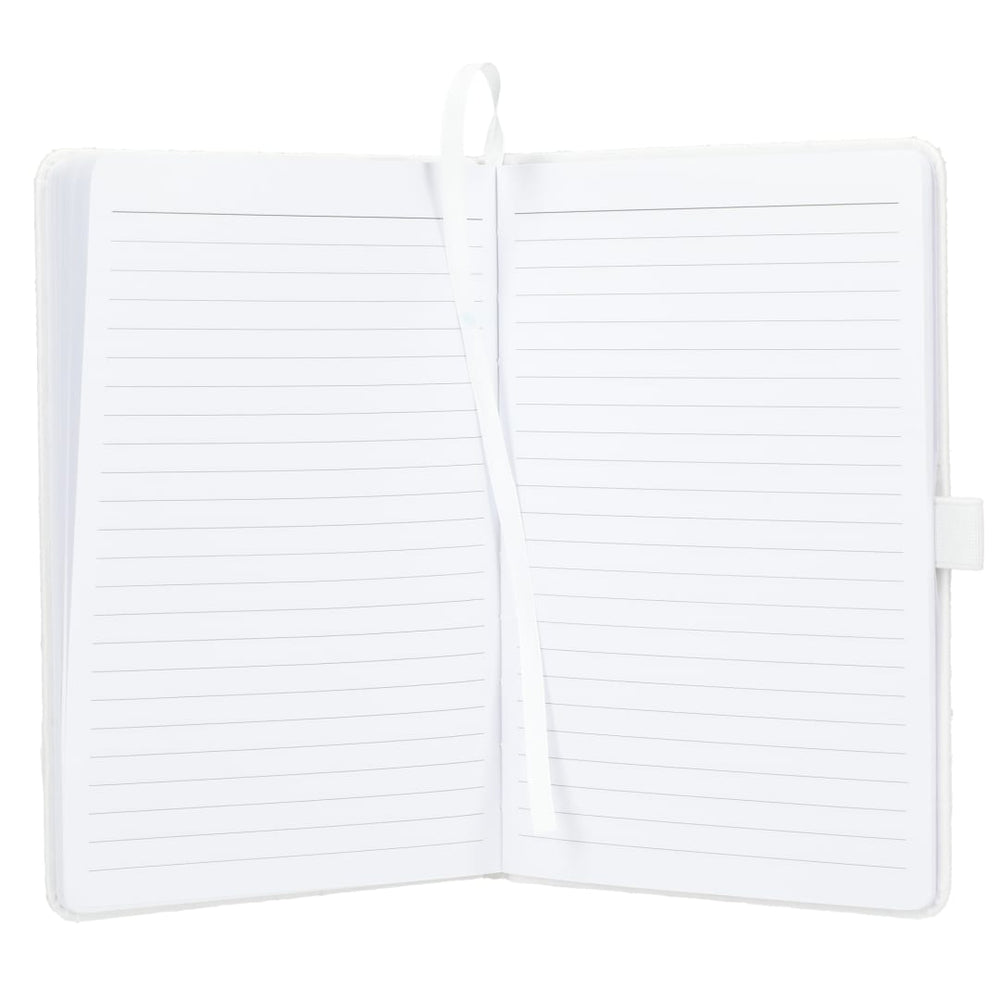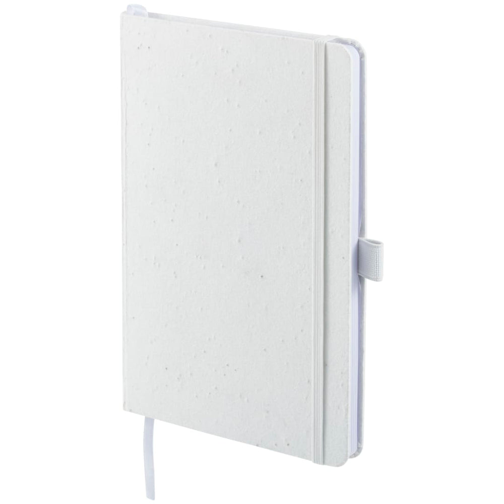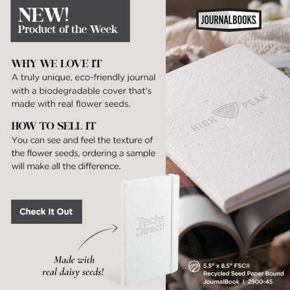 The 5.5" x 8.5" Seed Paper Bound JournalBook features a seed paper cover and 80 sheets of FSC®-certified recycled lined paper. Includes elastic band, pen loop, ribbon page marker and back pocket.
