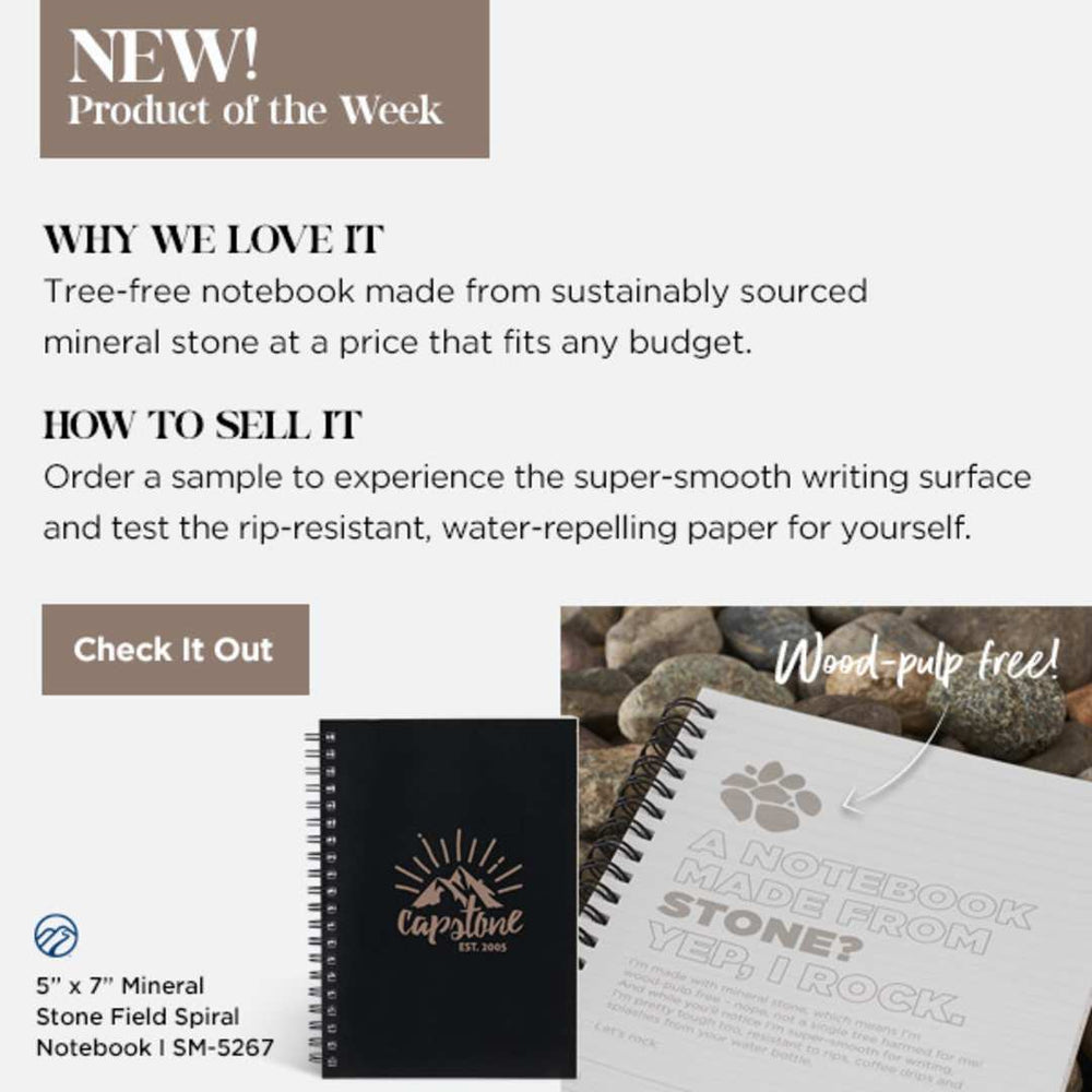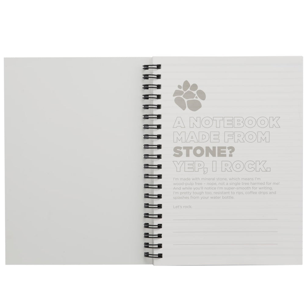 The 5” x 7” Mineral Stone Field Spiral Notebook features a stone paper cover, black wire binding and 64 sheets of white lined stone paper. Through a partnership with 1% For The Planet, one percent of sales of all EcoSmart® products are donated to environmental nonprofits.