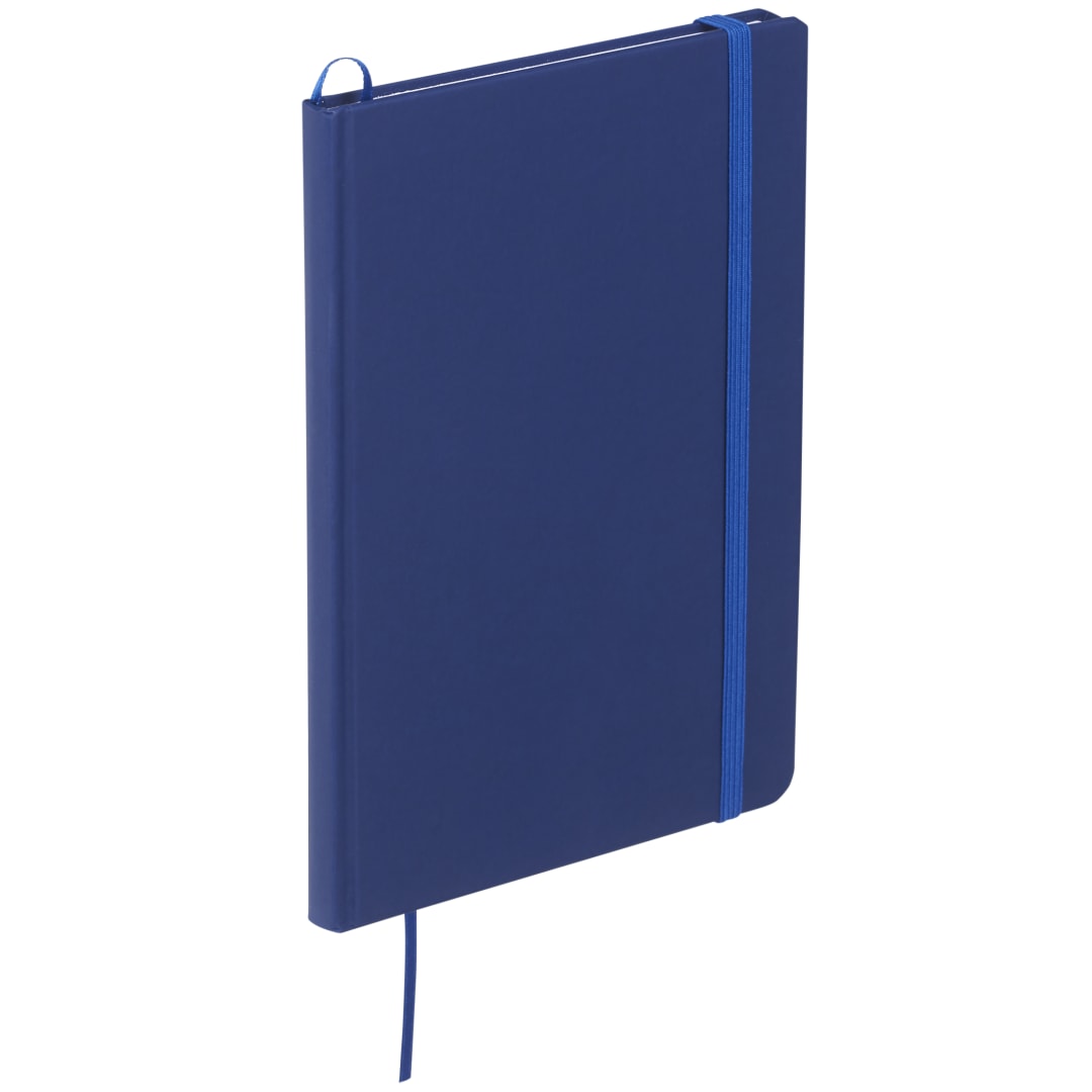 The 5" x 7" Snap Elastic Closure Notebook is an 80 white ruled page notebook with a matching color ribbon bookmark. Hard cover.