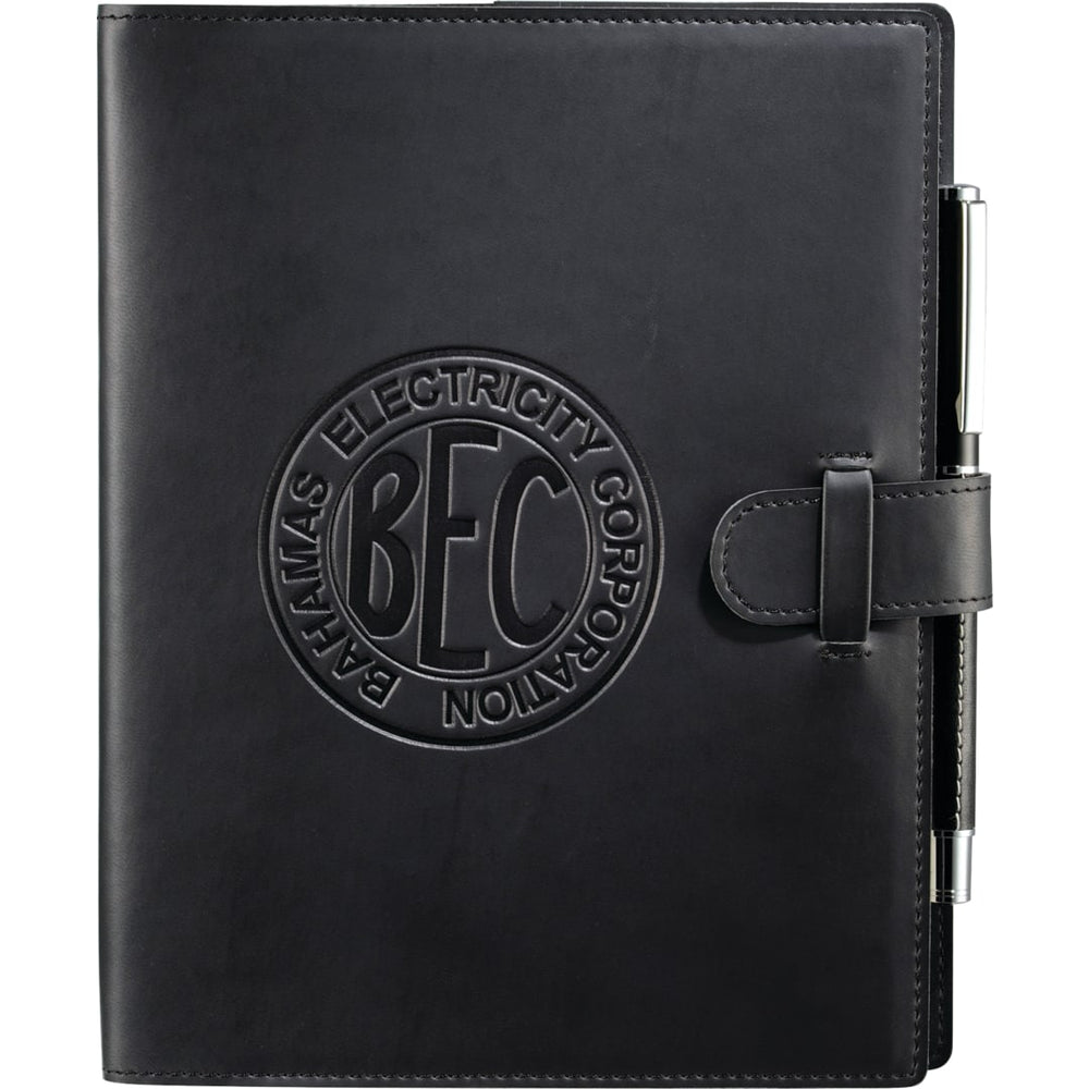Elastic pen loop. Tab and loop closure. Blue and silver ribbon page markers. Business card slot. 80 sheets white lined refill. Pen is not included.