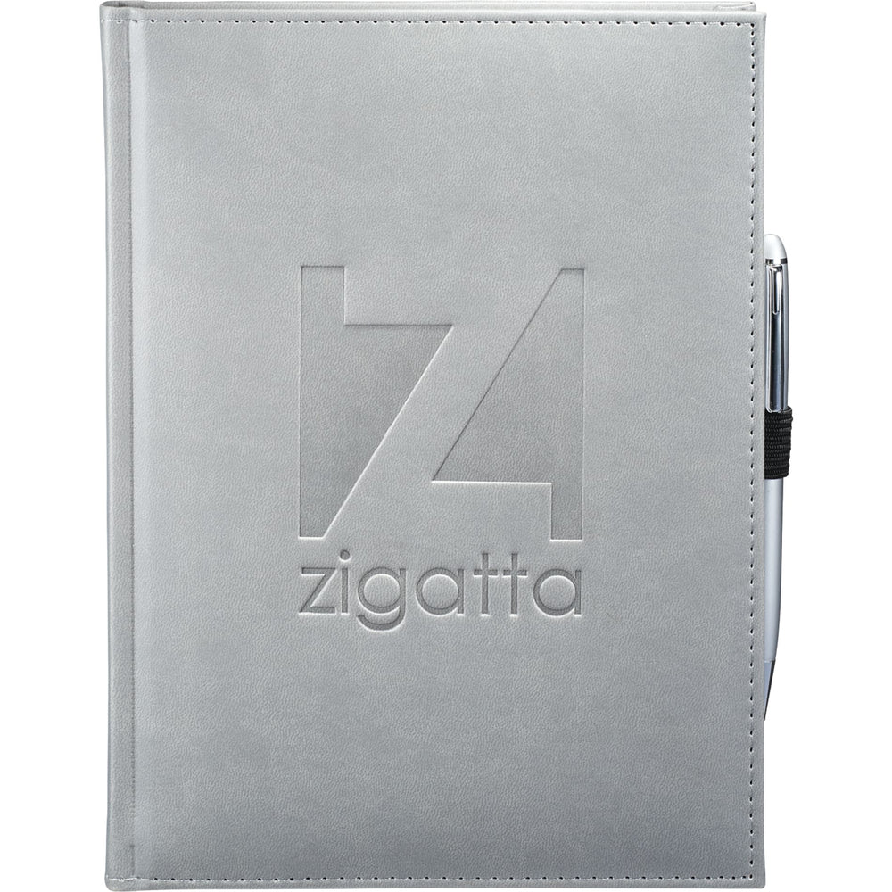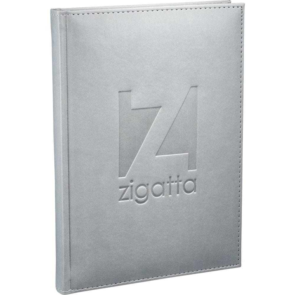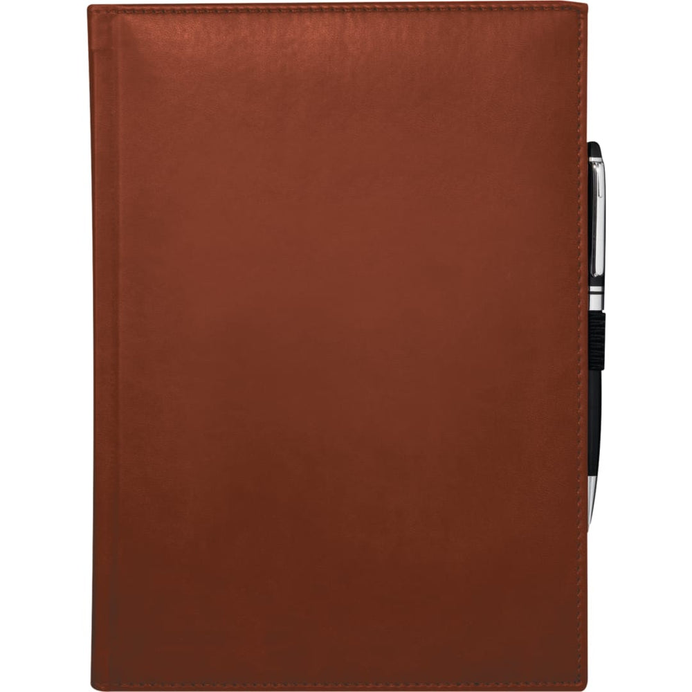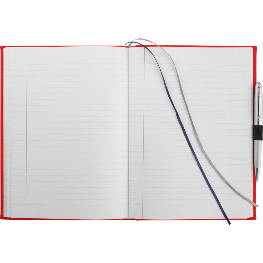 The 7" x 10" FSC Mix Pedova™ Large Bound JournalBook® is a hardcover bound journal featuring Italian UltraHyde construction. It contains 125 sheets of white lined FSC Mix paper with built-in ribbon page markers to help hold your place between uses. This stylish notebook also features an elastic pen loop, with pens available to order separately.