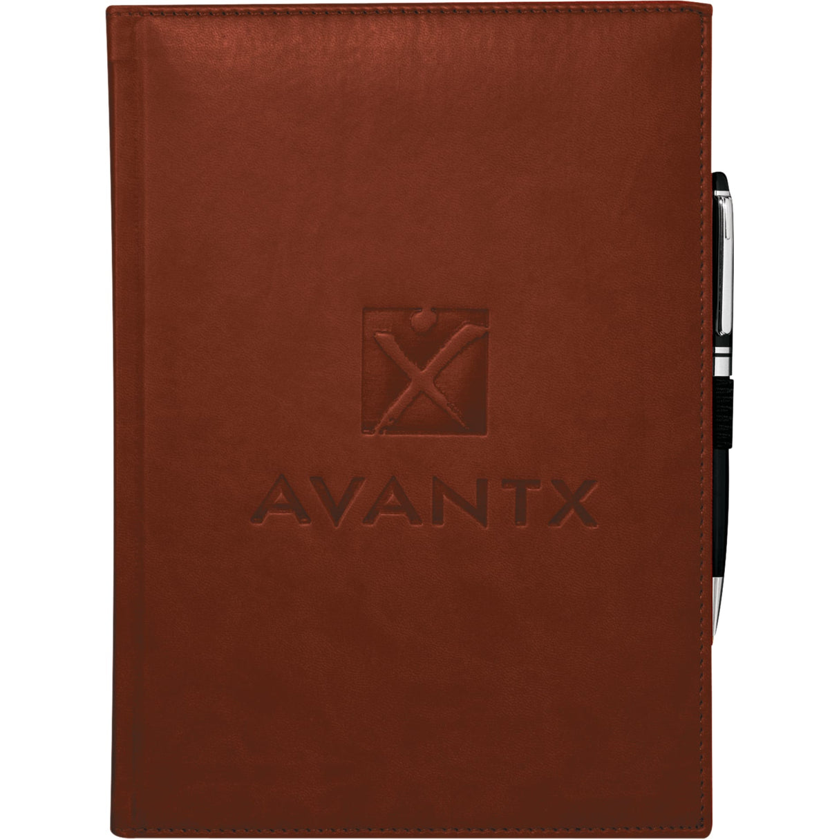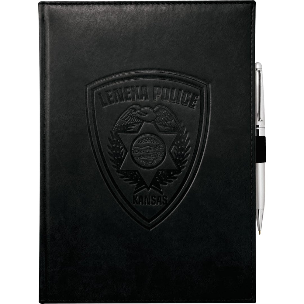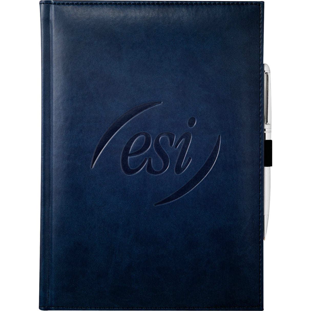 The 7" x 10" FSC Mix Pedova™ Large Bound JournalBook® is a hardcover bound journal featuring Italian UltraHyde construction. It contains 125 sheets of white lined FSC Mix paper with built-in ribbon page markers to help hold your place between uses. This stylish notebook also features an elastic pen loop, with pens available to order separately.