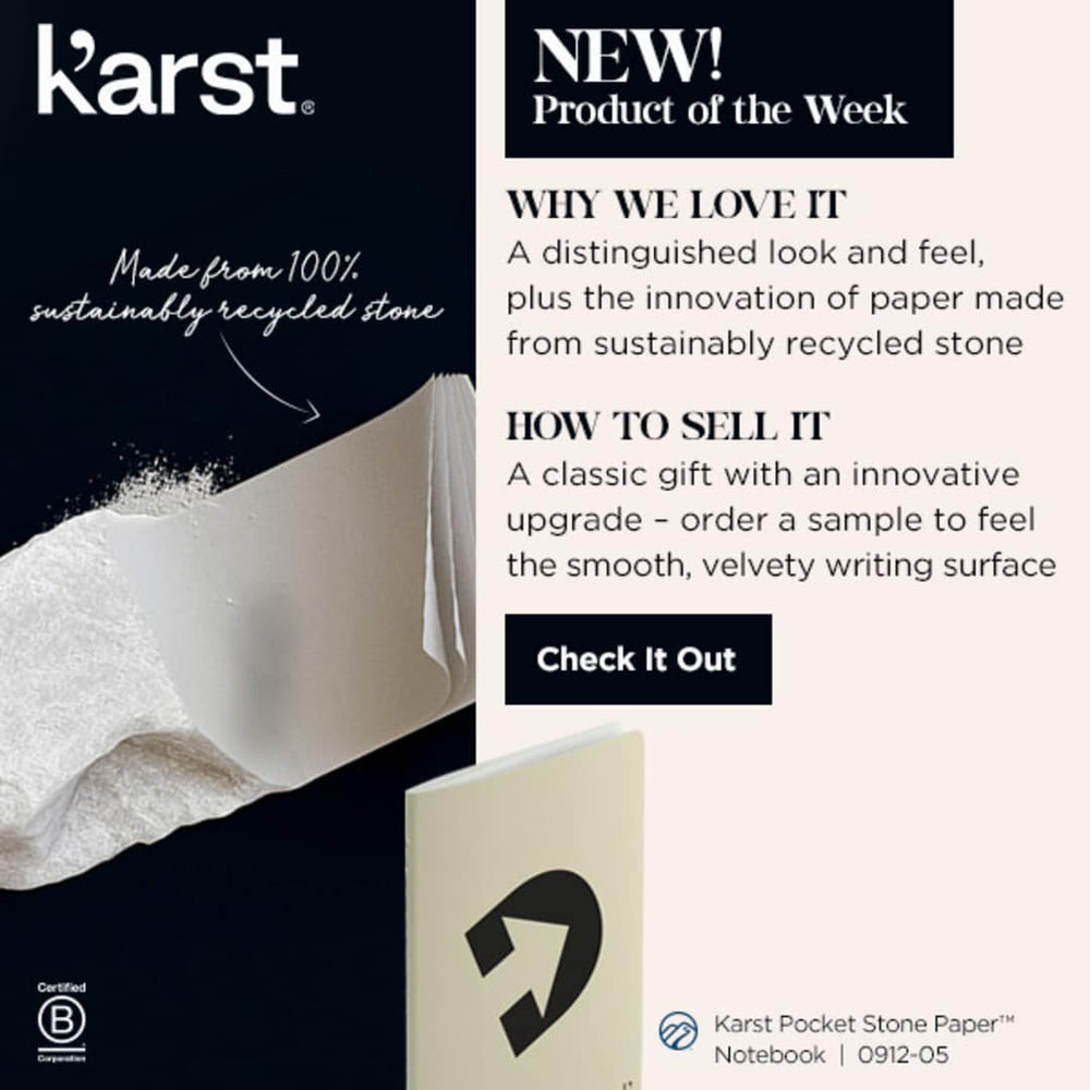 The Karst Pocket Stone Paper Notebook is perfectly sized to carry with you on the go. This notebook features 50 blank pages of recyclable stone paper which is waterproof, tear-resistant and allows for friction-free writing. Also includes a back pocket. Through a partnership with 1% For The Planet, one percent of sales of all EcoSmart® products are donated to environmental nonprofits.