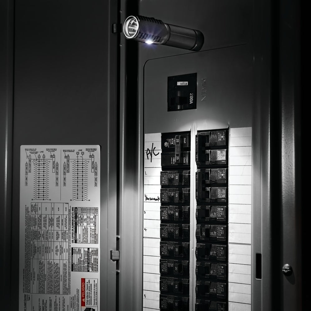 Great for on the job site or the weekend warrior, this double 3W CREE XPE high power aluminum flashlight with extra strength magnet is designed to stick to metal work surfaces. Push button on/off. 120 Lumens. 24hr Continuous lighting period. 3 AAA batteries included.