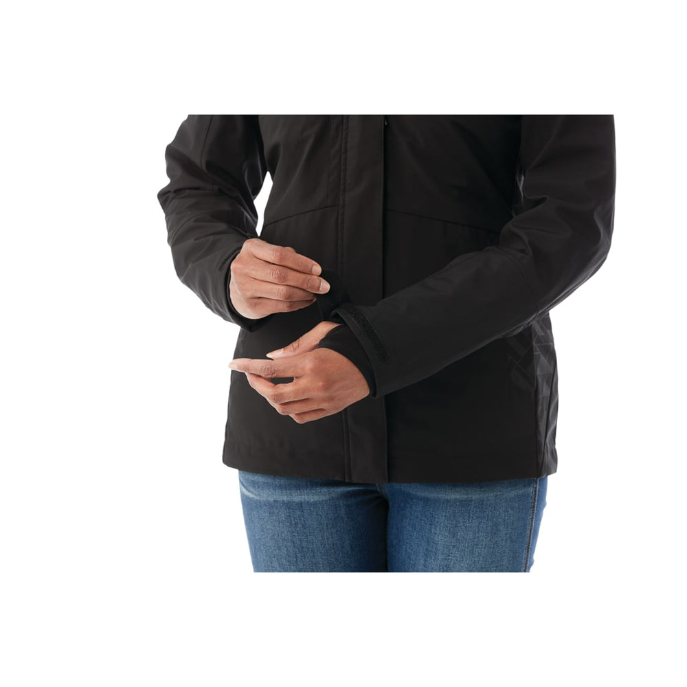 The Womens Yamaska 3-in-1 Jacket will keep you ready for any weather with a fully seam-sealed outer softshell jacket thats waterproof and breathable along with the removable insulated hybrid jacket liner that can be worn on its own or layered with the outer shell for extra warmth and protection. This high-performance jacket keeps comfort in mind, with extra collar padding for coziness, articulated elbows and ergonomic sleeves to help with movement and thumb exits to keep your hands free. Added features like easy grip zipper pulls, a detachable hood, elastic drawcords at the hem, interior media pocket and hidden pockets at the sleeve and interior make this jacket highly functional. The outer jacket has an on-trend graphic pattern and reflective elements.