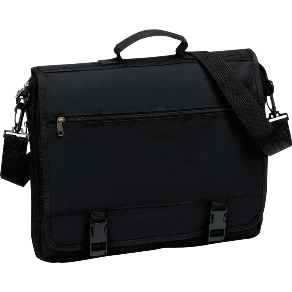 The Mariner Business Messenger Bag features an open main compartment with clipped flap closure. The expandable main compartment has a front zippered pocket and a deluxe organizer under the front flap that includes multiple pockets and pen sleeves. It also features a padded top carry handle and a detachable, adjustable shoulder strap.