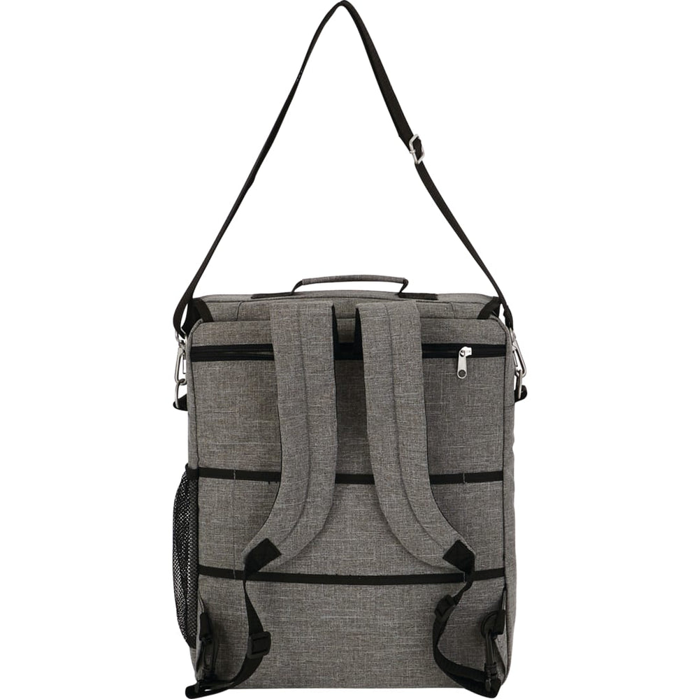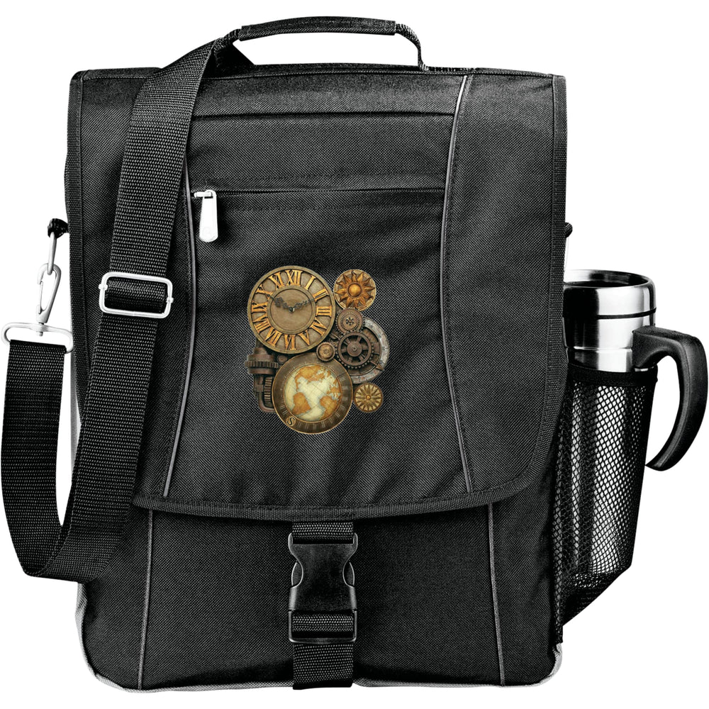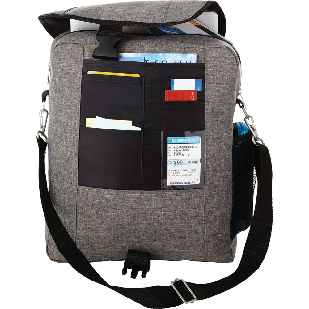 Large zippered main compartment can hold up to a 15" laptop, accessories and documents. Zippered rear pocket hides backpack straps. Easily slips over a trolley handle. Side mesh pocket fits beverage bottles. Additional storage on flaps of zippered pocket. Business organizer hides securely under flap. Detachable, adjustable shoulder strap. Disclaimer: There may be minor variations in color of the actual product due to the nature of the fabric dyes, weaves and printing.