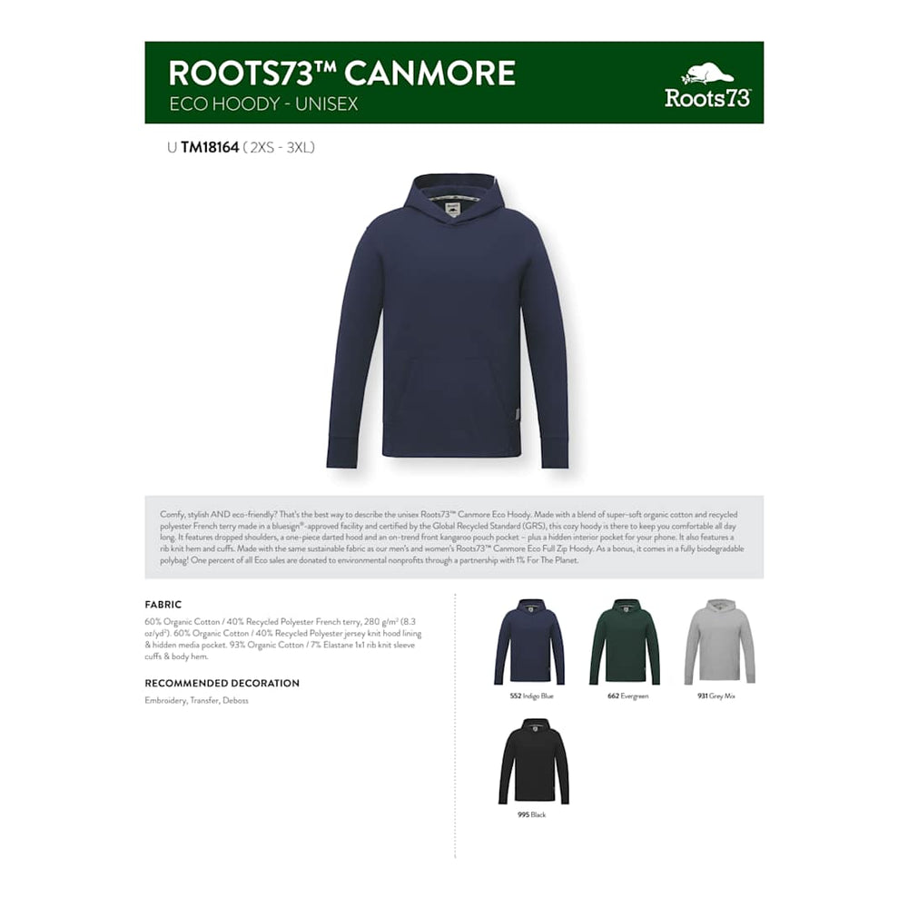 The Canmore Eco Hoodie is a classic style sweatshirt. This hoodie is made with soft, cozy, french terry and a jersey-lined hood to keep you comfy and warm. This pullover hoodie is giving you all the style you've come to expect from the Roots73 brand. The Canmore Eco Full Zip Hoodie has a kangroo pouch pocket to keep you warm and is a must-have on any outdoor adventure. This style is in our Gender Neutral sizing and is inclusive to many demographics. One percent of all Eco sales are donated to environmental profits through a partnership with 1% For The Planet.