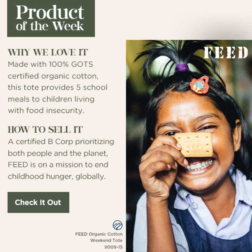 The FEED Organic Cotton Weekend Tote is perfect for carrying your stuff and feeling generous. Proceeds from this tote helps provide 5 school meals for kids worldwide living with food insecurity. Crafted using 12oz. 100% GOTS Certified Organic cotton and stylish copper rivets – this tote is both durable and classic – designed to be kept in rotation and out of landfills. Inside the tote you’ll find a pocket for extra organization with the iconic FEED giveback message screen-printed on the pocket.