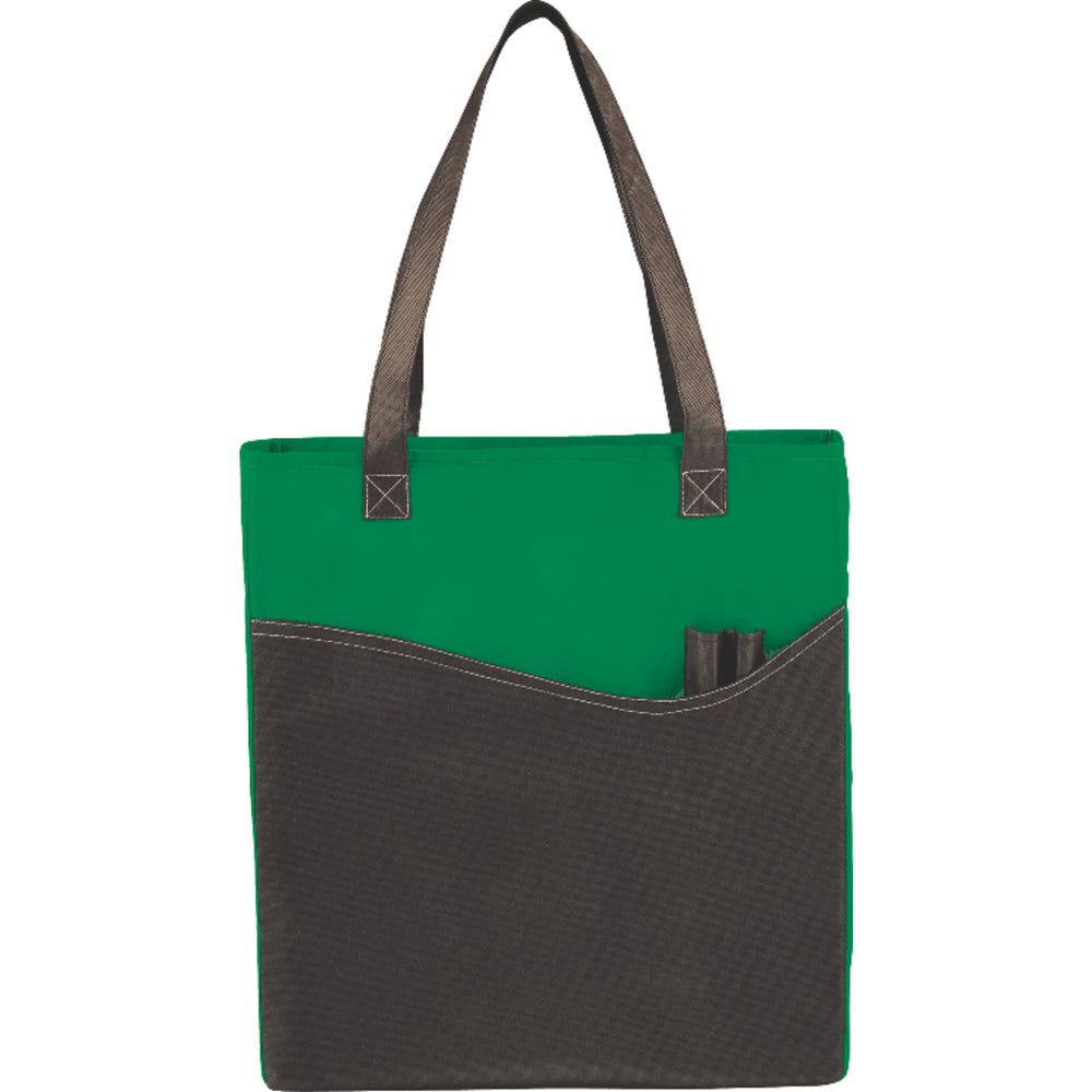 The Rivers Pocket Non-Woven Convention Tote has lots of storage including an open main compartment, front pocket and two pen pockets. Great for tradeshows and conventions, it's also reusable and comes with 26 inch handles. Gusset & Handle Decorating does not qualify for one day turn.