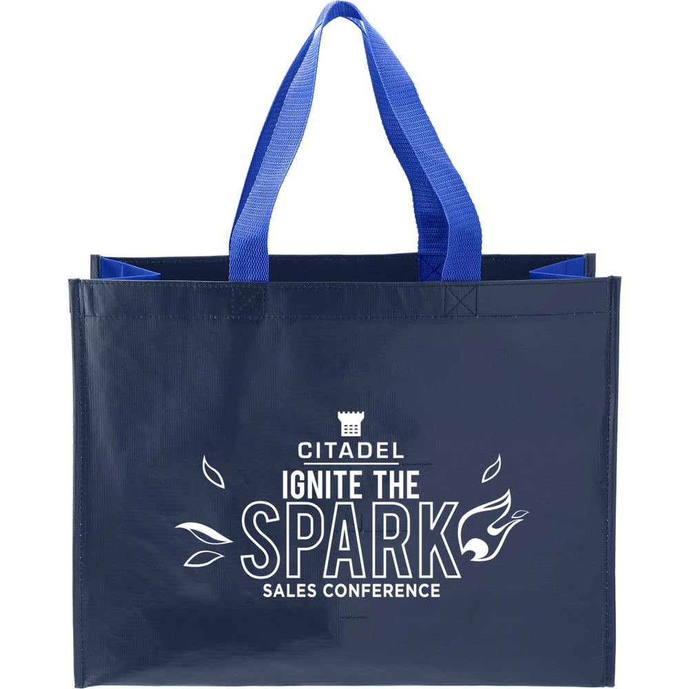 The RPET Laminated Matte Non-Woven Shopper Tote features a retail-inspired design with a soft RPET spun bond non-woven main material. It also includes double nylon webbing handles and an eye-catching recycling graphic on the side panels. Through a partnership with 1% For The Planet one percent of sales of this and all EcoSmart products will be donated to nonprofits dedicated to protecting the planet. This tote was previously Leed's 2160-51, RPET Laminated Matte Non-Woven Shopper Tote.