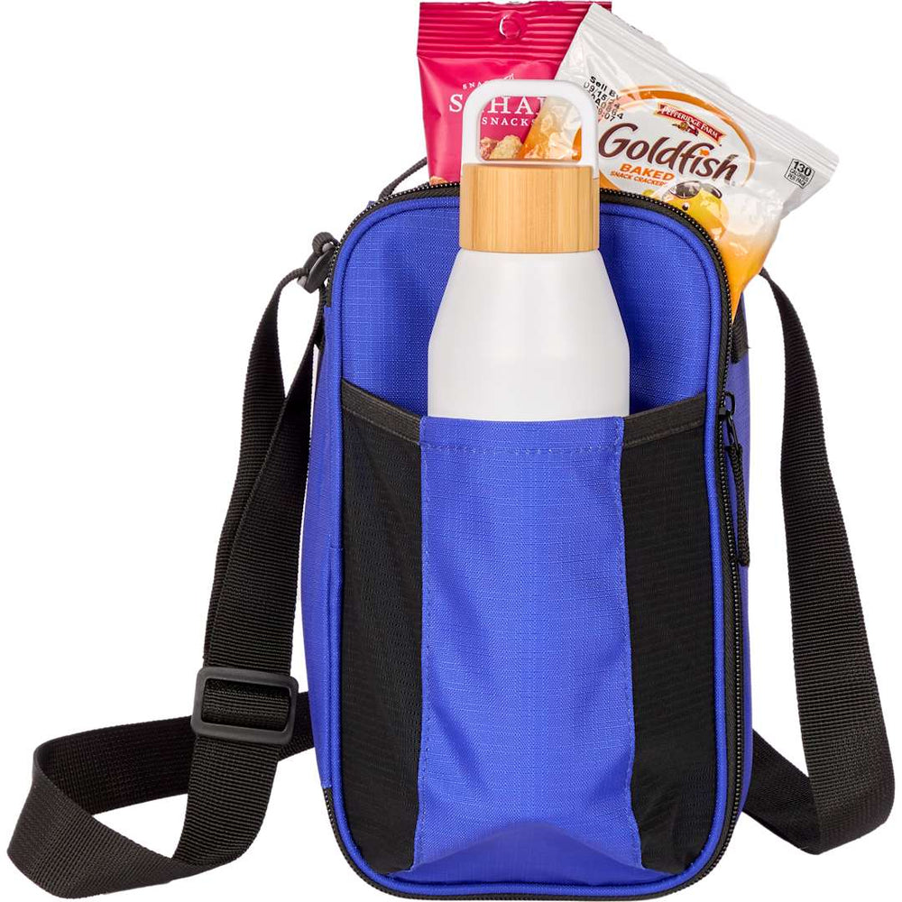 The Crossbody Recycled 6-Can Cooler is the ideal companion for staying refreshed on the go! With a capacity to hold up to six cans, this cooler features gray PEVA lining for insulation and an elastic mesh front pocket to secure a water bottle. The adjustable strap and top handle offer versatile carrying options, while the zippered closure keeps contents secure. Made from recycled materials, this cooler also supports environmental nonprofits through a partnership with 1% For The Planet.
