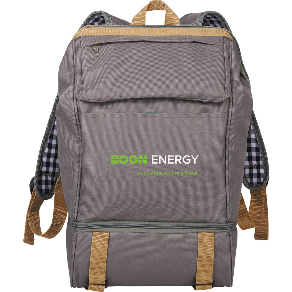 Enjoy the great outdoors in style with the 11pc Café Picnic Backpack for Two. The main compartment has a wide opening to easily access the picnic pieces. The separate PEVA insulated cooler storage compartment fits 6 cans. Set includes 2 each: 8” plates, mugs, forks, spoons, and napkins. Perfect for tailgating, a trip to the park, and everything in-between! A great companion piece is the Picnic Blanket (1070-15).