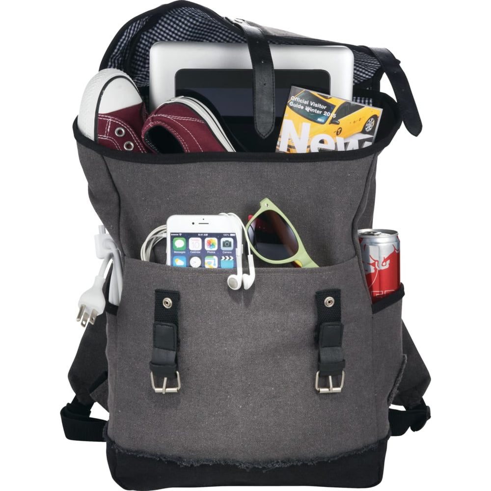 The Field & Co.® Hudson 15" Computer Backpack is part of a collection that has a gritty, urban look and feel with a modern functional design. Spacious open main compartment snaps shut with custom Field & Co. rivets. Exterior slash pockets allow you to store your water bottle or anything else you need quick access to. Black and white micro gingham print on the interior adds a stylish detail while the padded laptop compartment will keep your 15.6 inch computer safe.