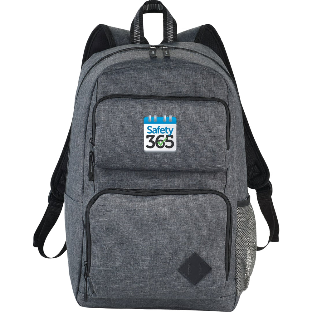 The Graphite Deluxe 15" Computer Backpack is a stylish backpack that offers on trend looks with exceptional value. Zippered main compartment with padded laptop sleeve holds up to a 15.6 inch computer, dedicated iPad®/tablet pocket with room for all your other business essentials. Two front zippered pockets are large enough for power banks, cables, pens and notecards. The two front pockets also offer flexible decorating locations. Side water bottle pocket. Top grab handle. Adjustable padded backpack straps. Disclaimer: There may be minor variations in color of the actual product due to the nature of the fabric dyes, weaves and printing.