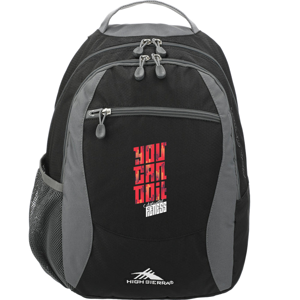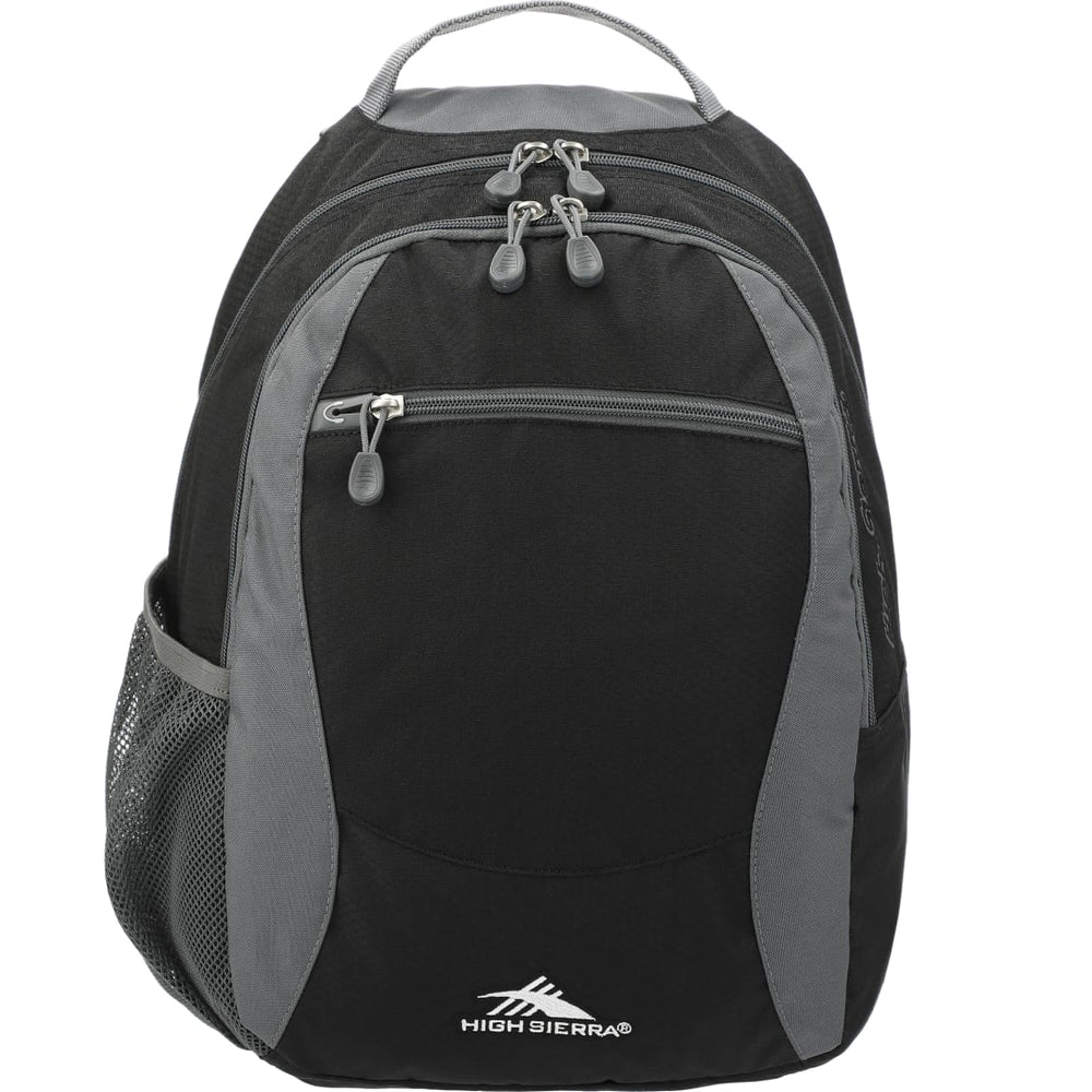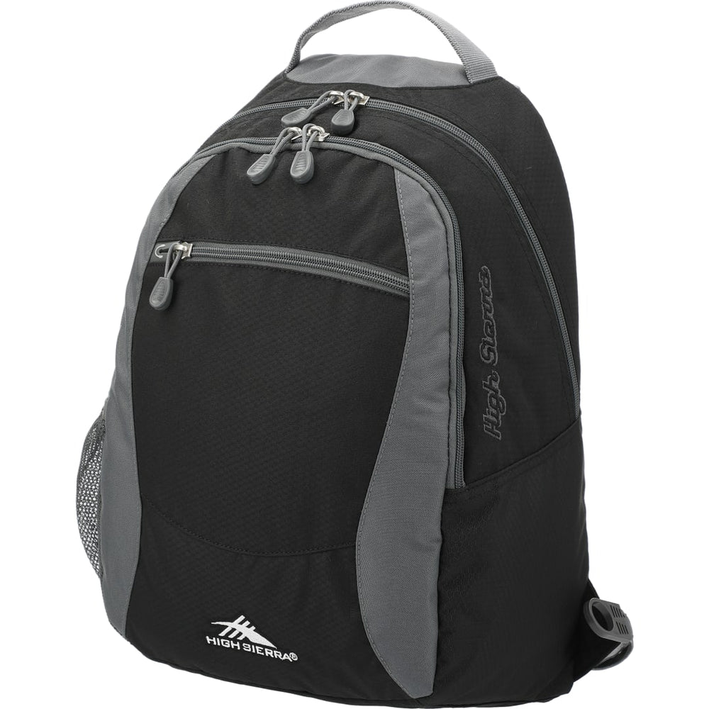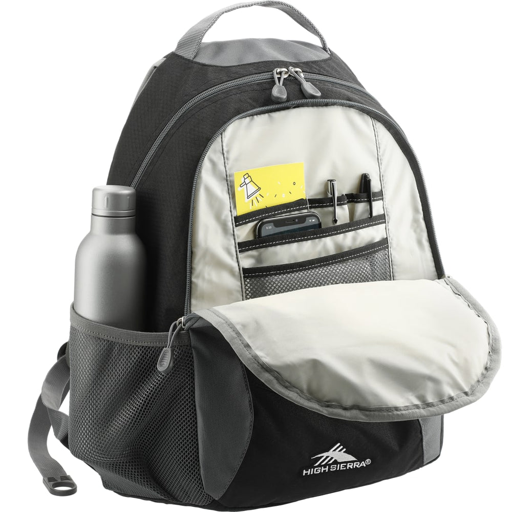 The High Sierra® Curve Backpack features a large front load main compartment and an organizer compartment with pen pockets. A front zippered accessory pocket includes a headphone port. Large gusseted side mesh beverage pockets. There is an-shaped padded shoulder straps with a cell phone/media pocket, a padded back panel and a heavy duty webbing grab handle. Signature High Sierra hardware. Includes lifetime warranty.