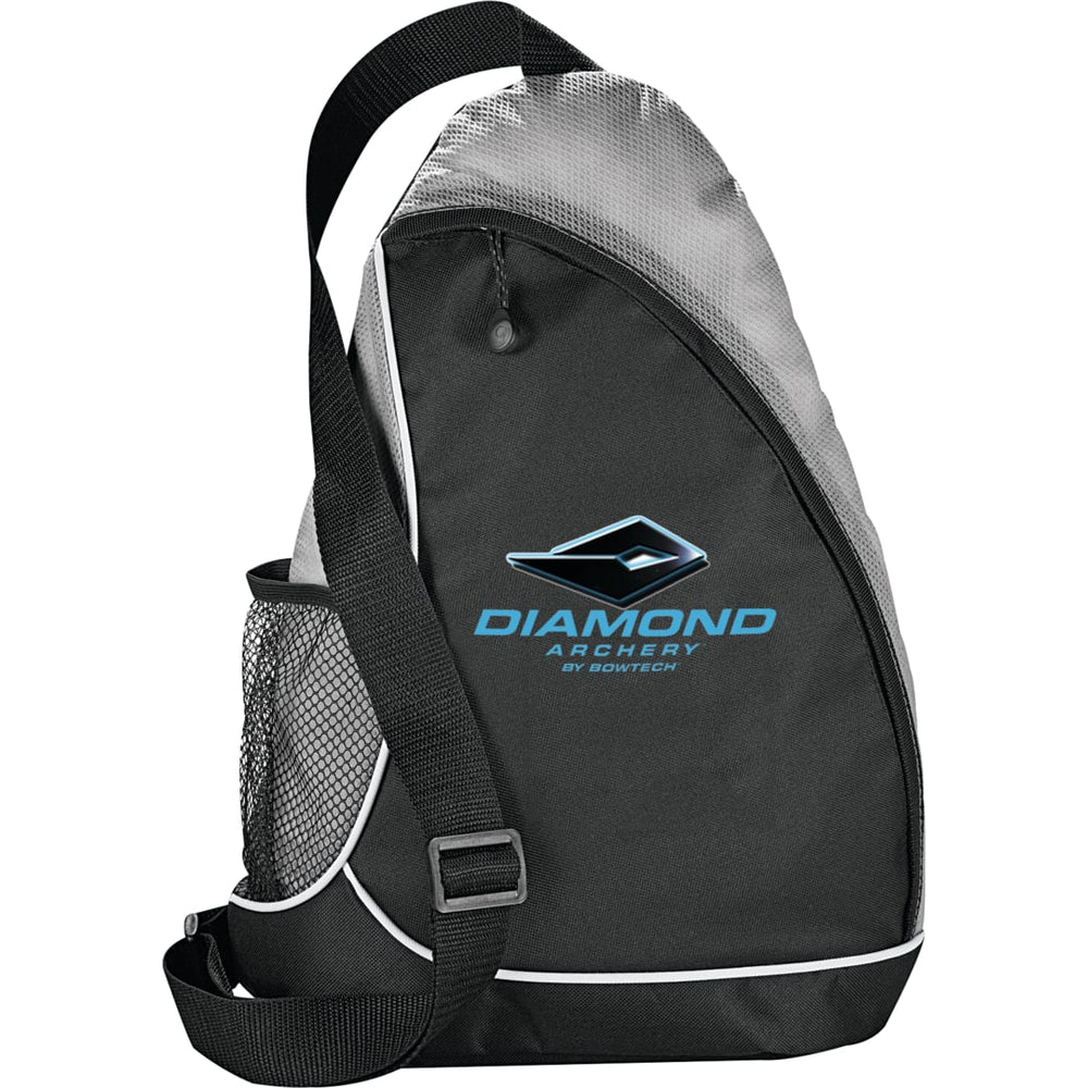 The Sling Shot Sling Backpack features a main zippered compartment, a side mesh water bottle pocket and an adjustable cross-over shoulder strap.