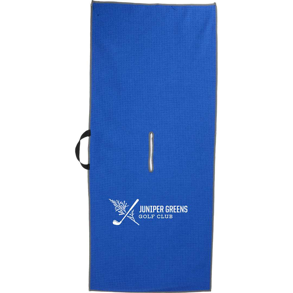 The 17" x 40" Recycled Slip-Over Player Towel is designed to keep your clubs clean and dry on the course. Made from recycled microfiber waffle polyester, this towel features a highly absorbent and soft texture, perfect for cleaning clubs, balls, and accessories. The large center slit allows it to slip over a club head for easy carrying, while a sewn-on loop offers convenient hanging on your golf bag. Made with recycled materials, this eco-friendly towel supports environmental nonprofits through a partnership with 1% For The Planet, giving back with each use.