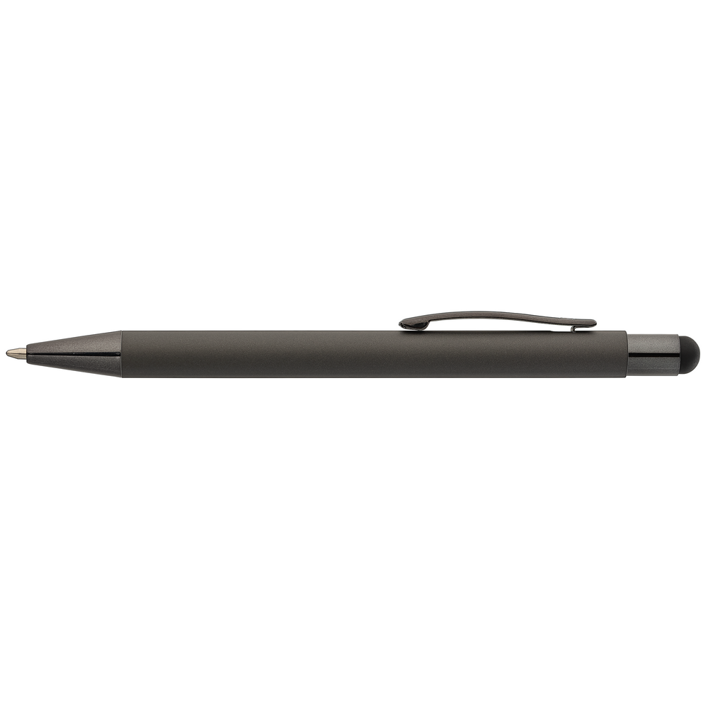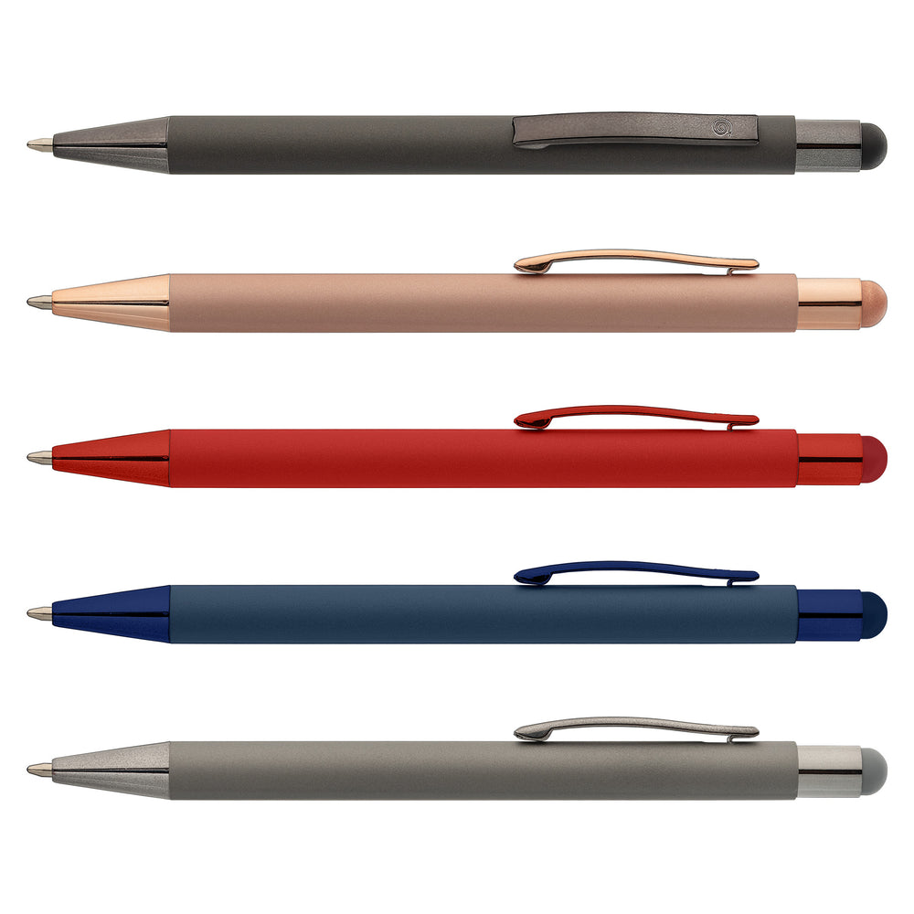Elevate your brand with the Bowie Softy Monochrome Stylus Pen! This sleek and elegant metal pen features an on-trend soft-touch rubberized finish barrel, and a touchscreen stylus for all your devices. This medium ballpoint aluminum pen comes with a Premium Italian refill with German ink, allowing you to write longer. Your logo is presented on reflective mirror-finish metal, so your brand will capture the spotlight.