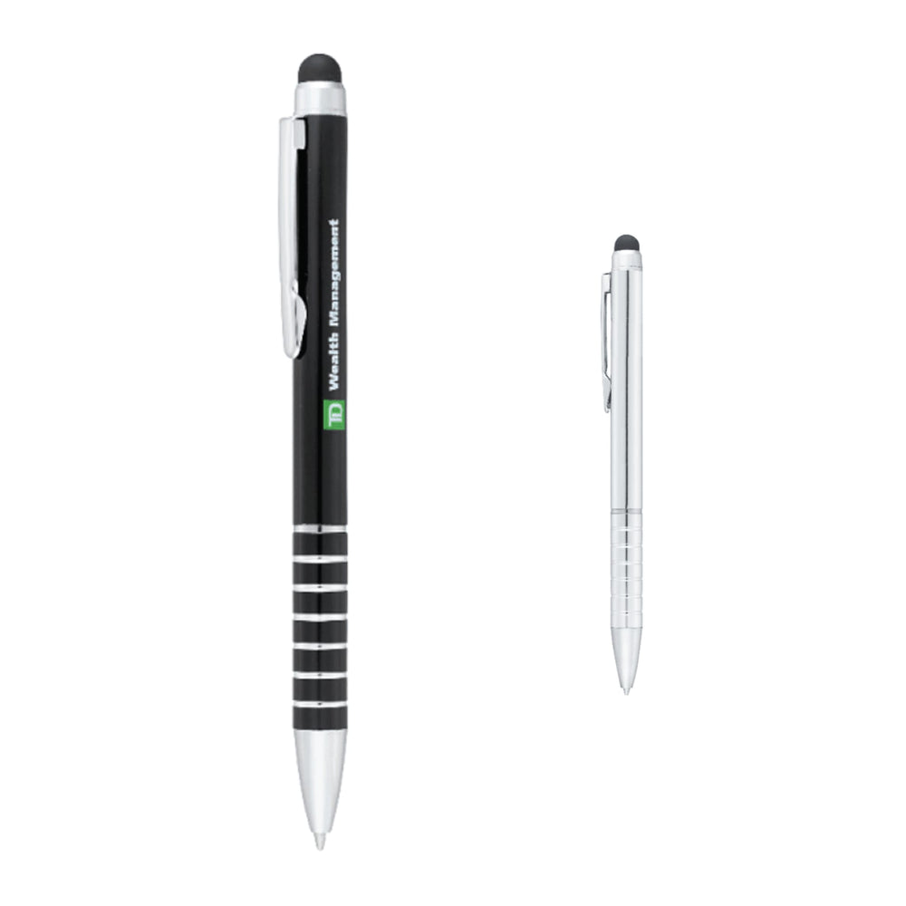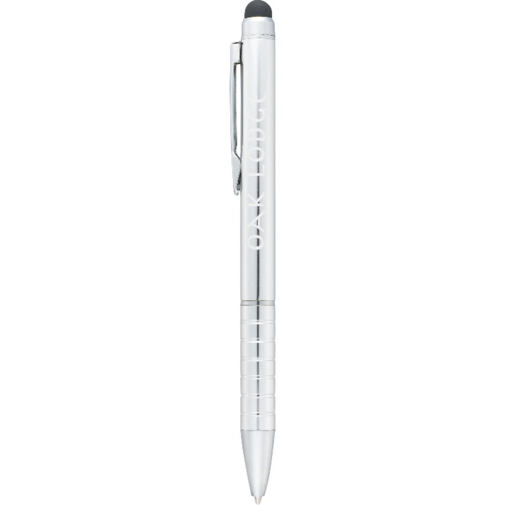 The Preston Dual Ballpoint Stylus combines a classic ballpoint silhouette with the added stylus function. Grip is artfully textured with chrome rings. Retractable twist action mechanism with standard blue ballpoint ink cartridge and 1.0mm pen tip. Laser 360 is available on this style. Laser finish is matte-white.